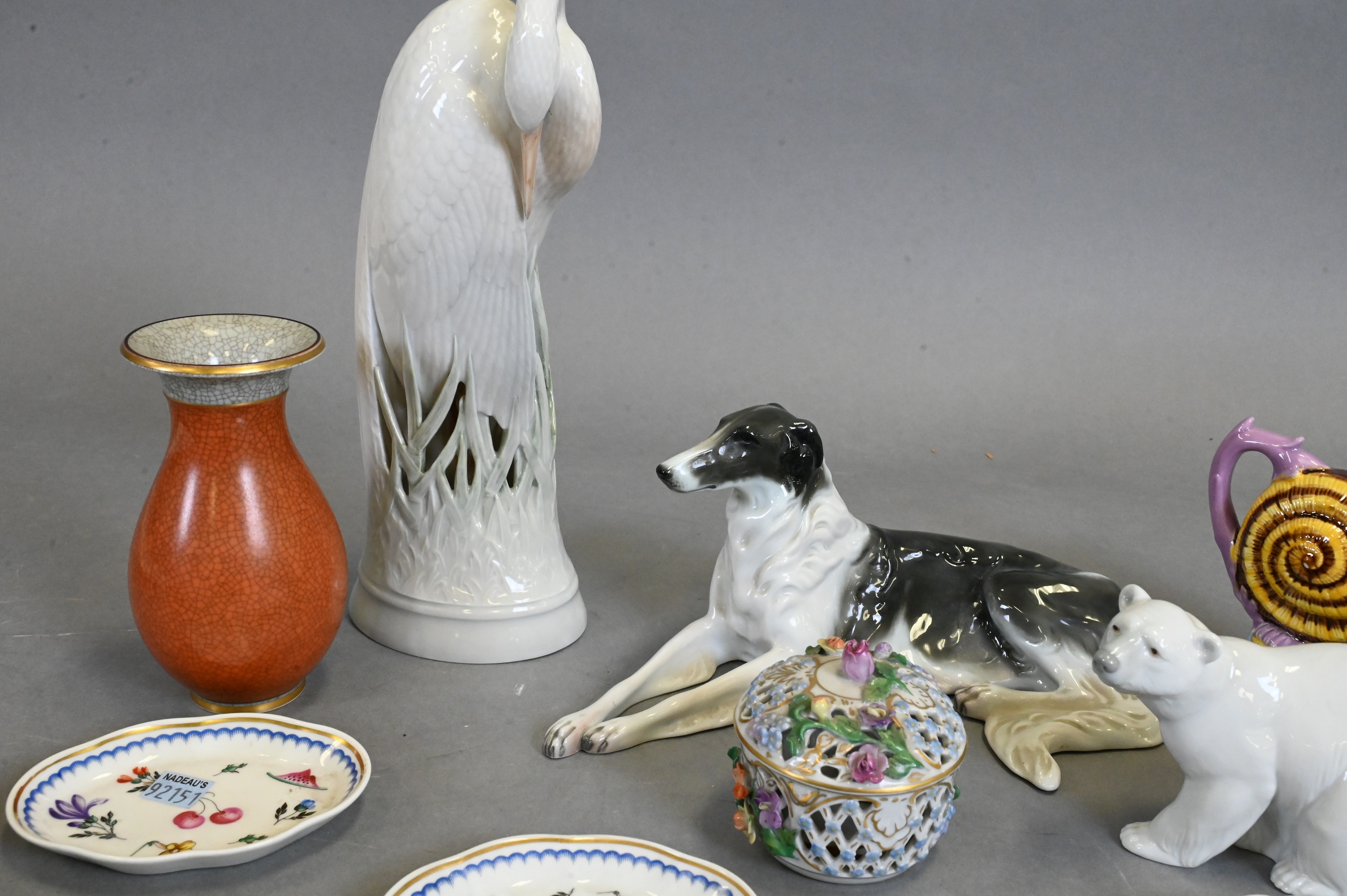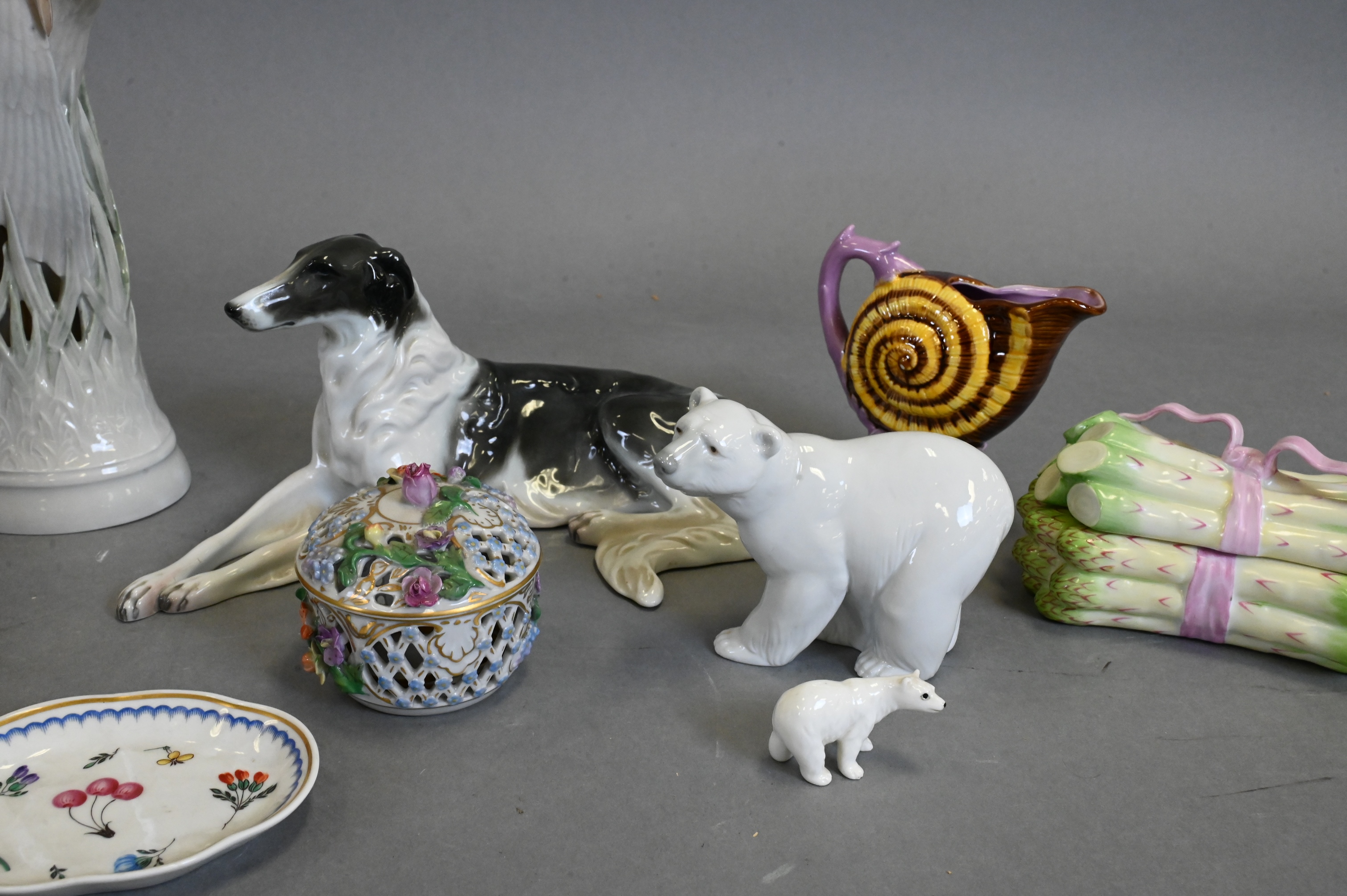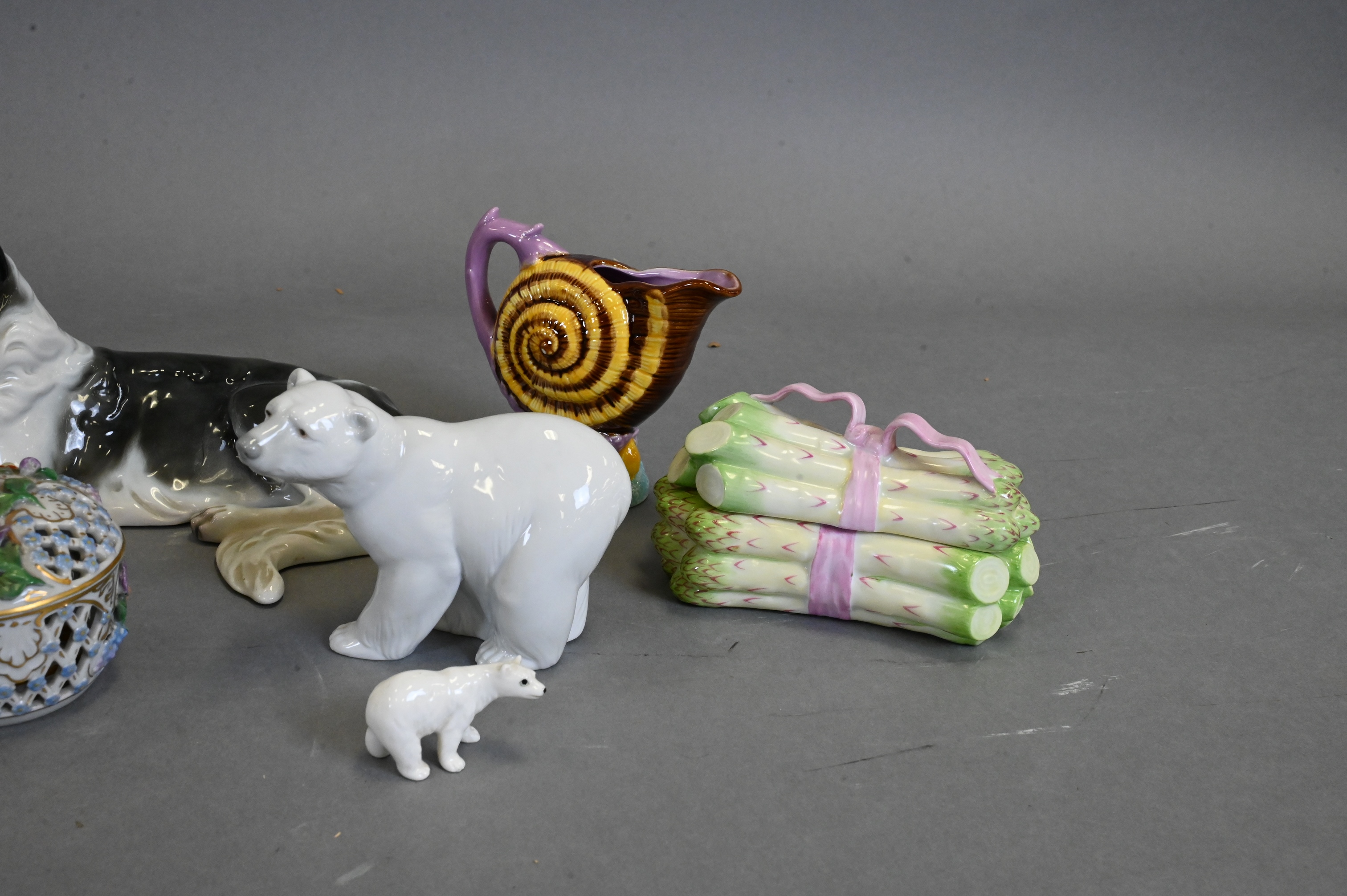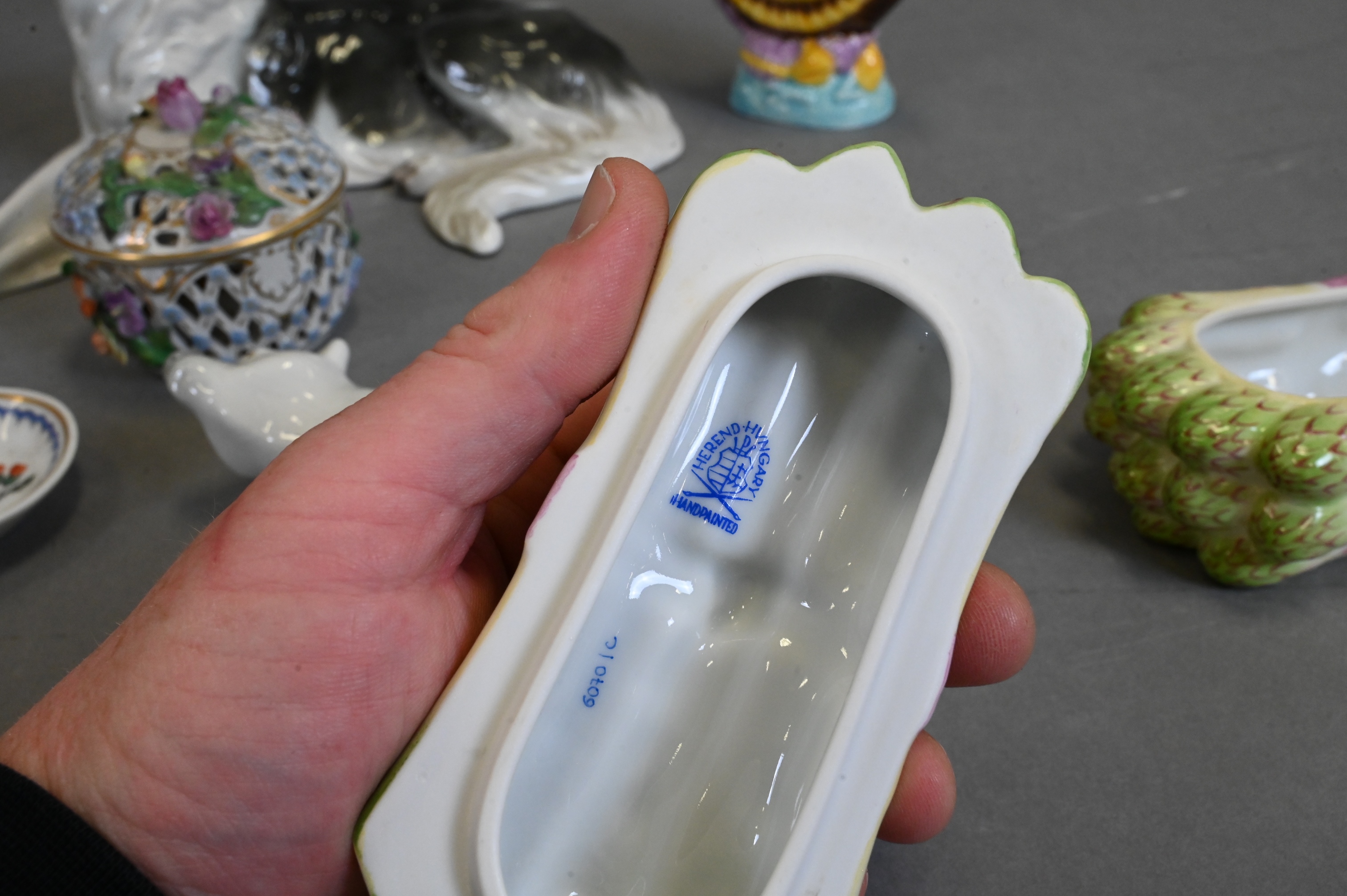 to include Royal Copenhagen heron/ crane, Lladro polar bear with original box, Herend asparagus box, Mottahedah shell pitcher, Carl Theime reticulated Dresden trinket box, etcetera