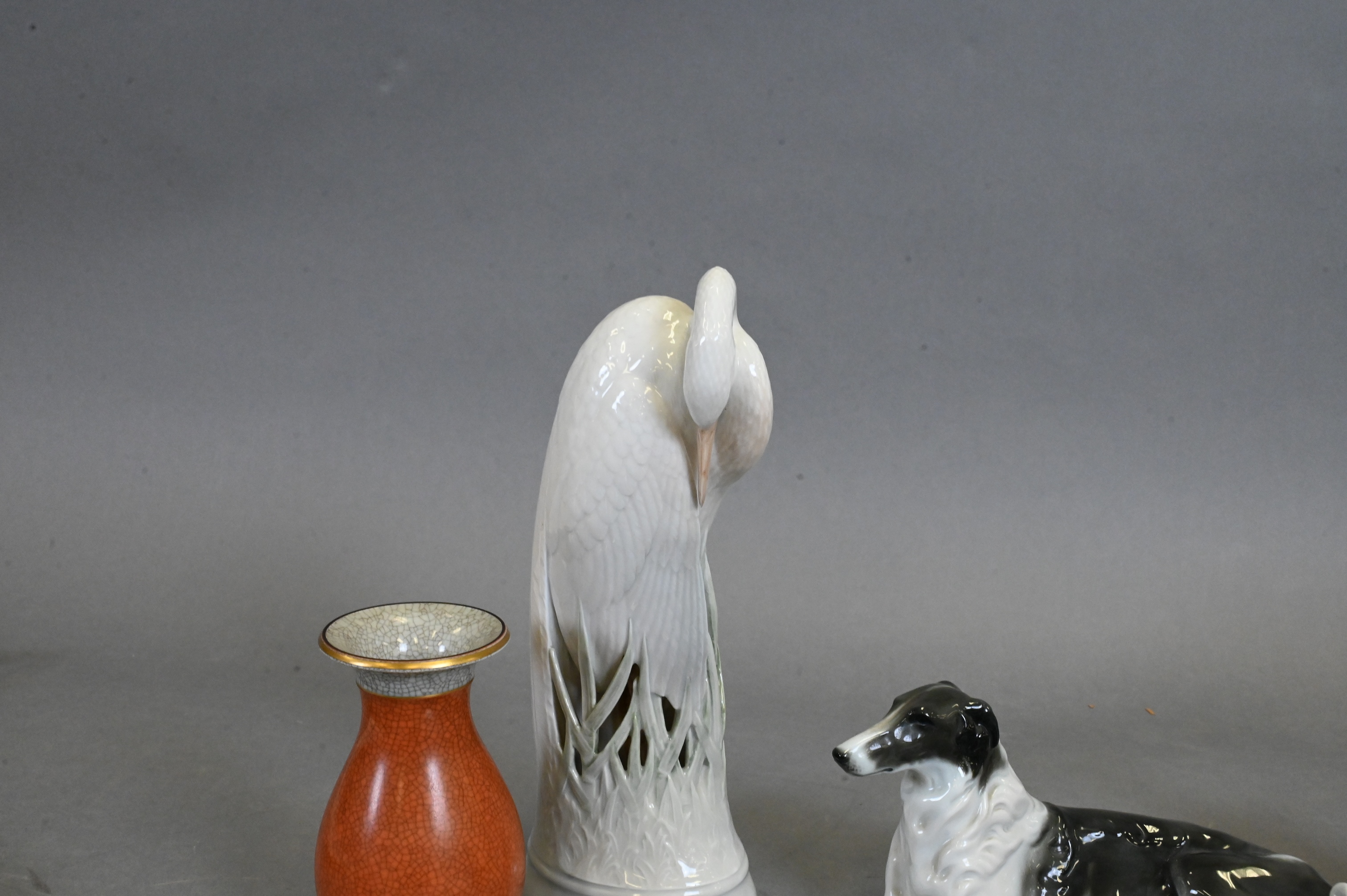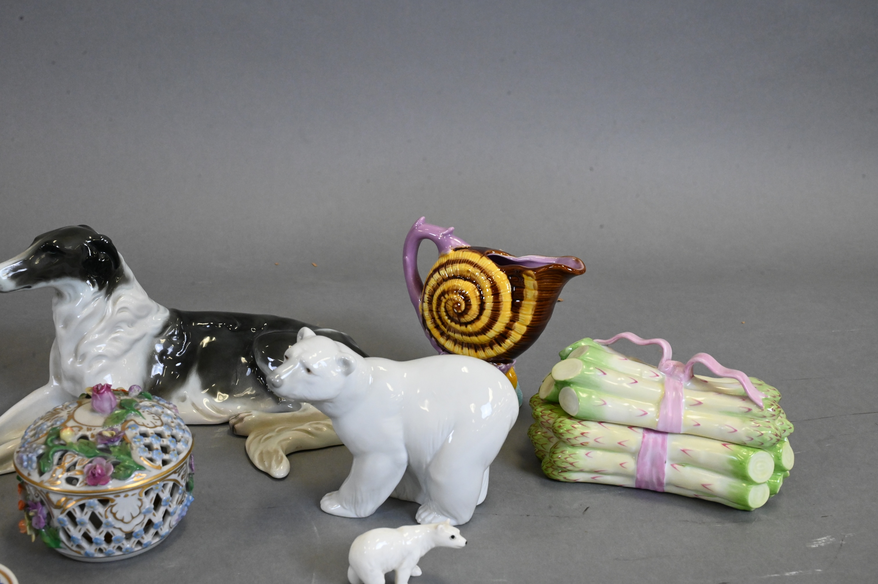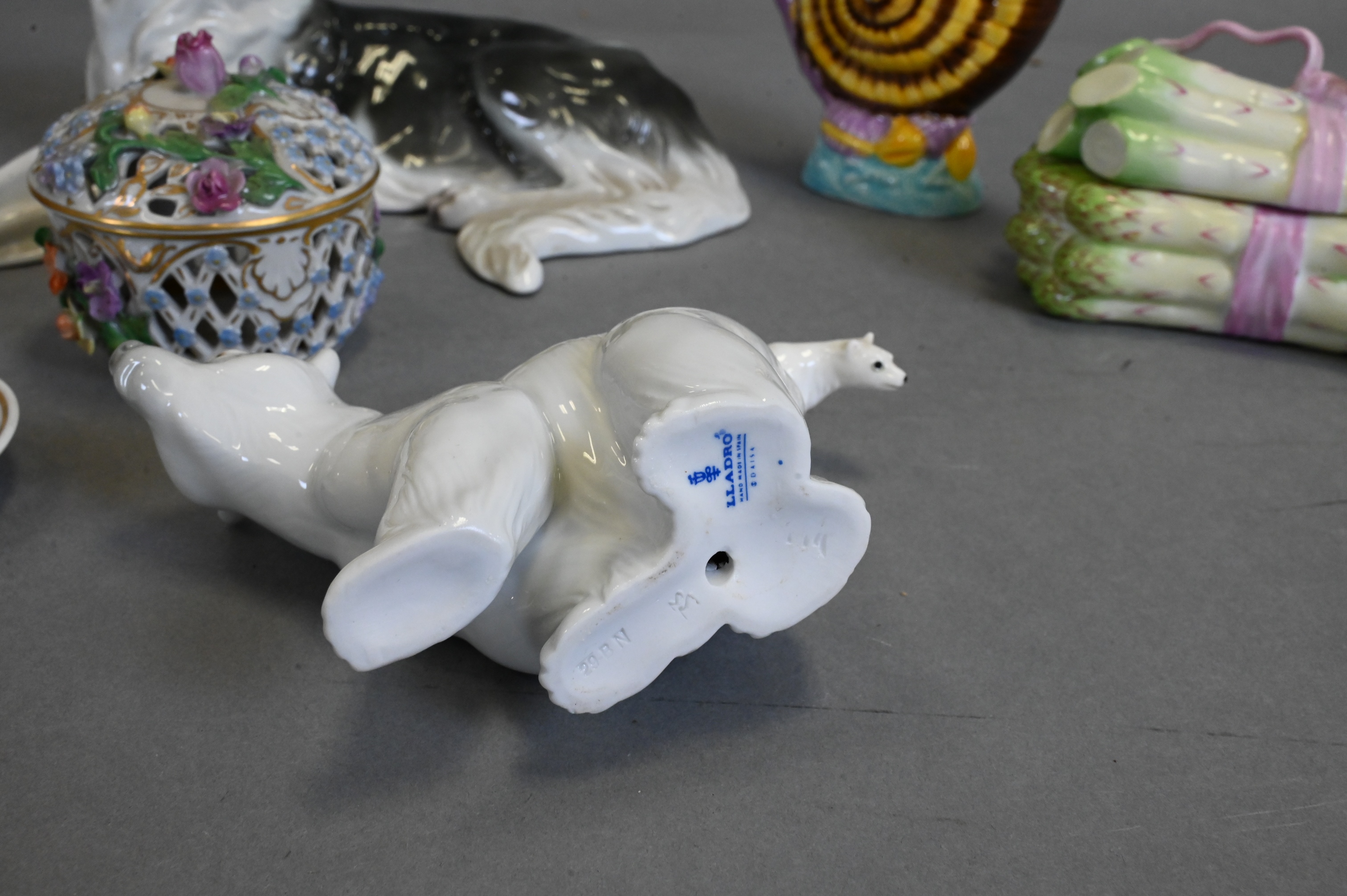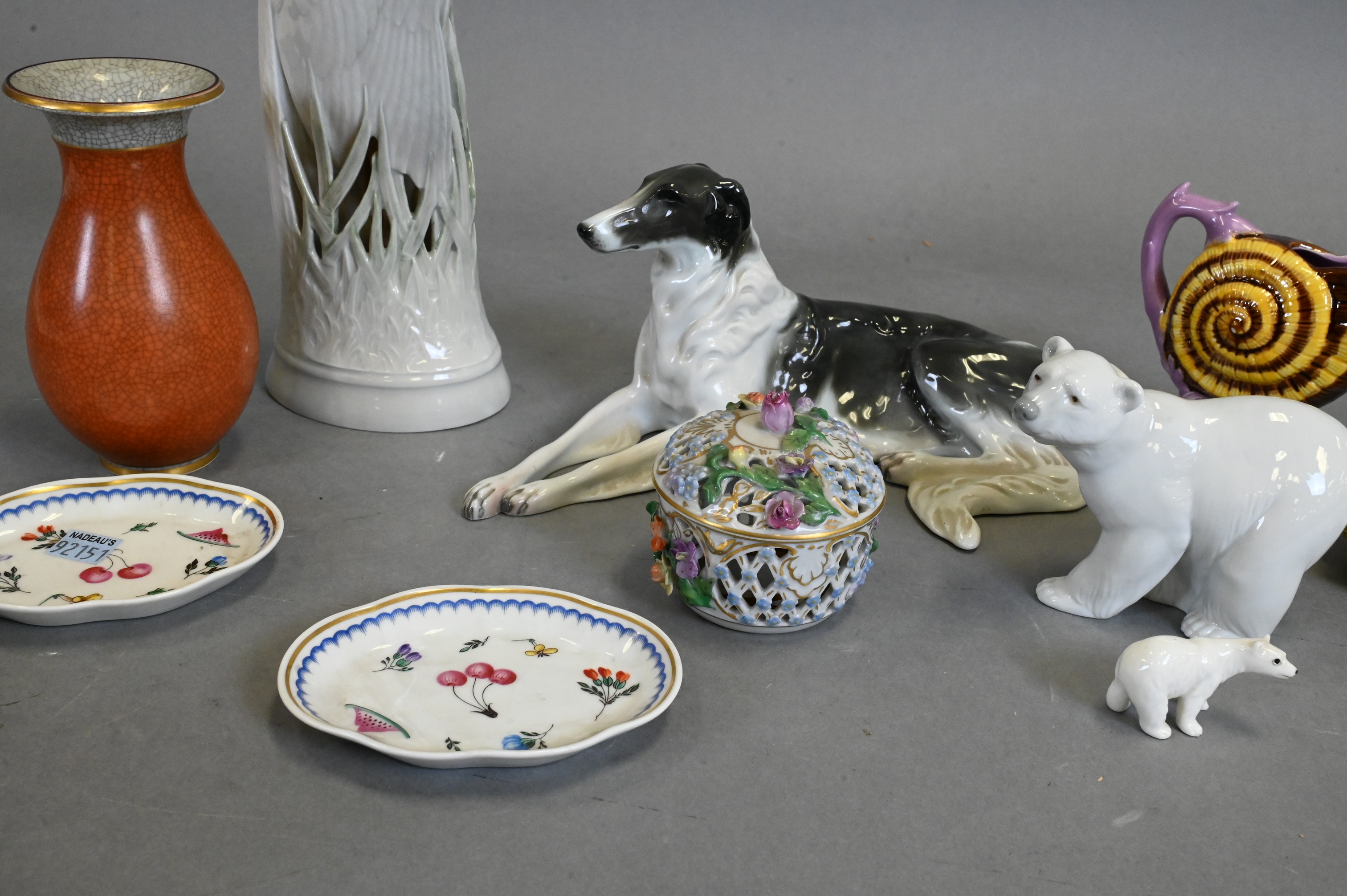 to include Royal Copenhagen heron/ crane, Lladro polar bear with original box, Herend asparagus box, Mottahedah shell pitcher, Carl Theime reticulated Dresden trinket box, etcetera