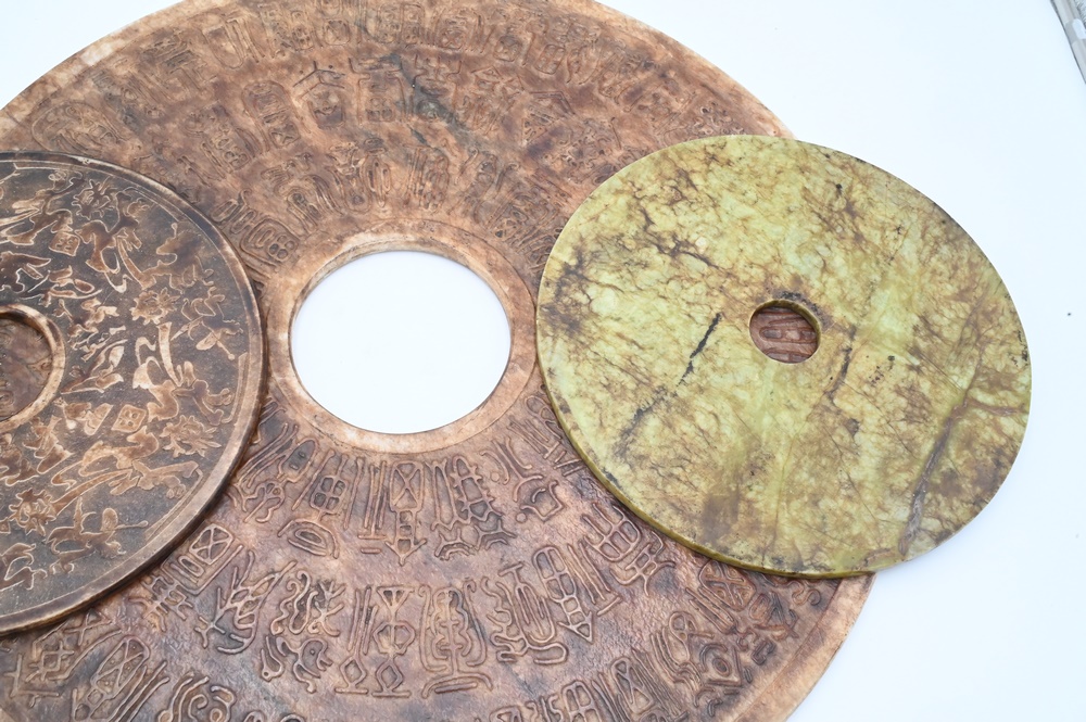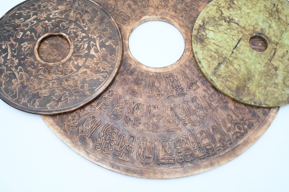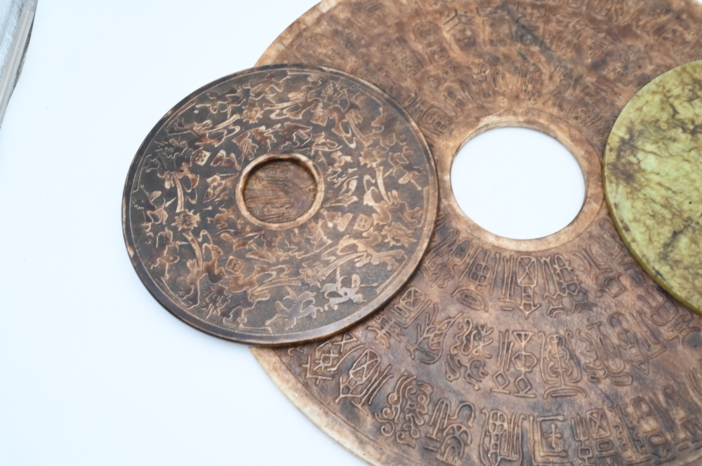 Lot 469: Three Large Carved Hardstone Chinese Disks, diameter 23 1/2 inches, 11 1/2 inches, 12 inches.