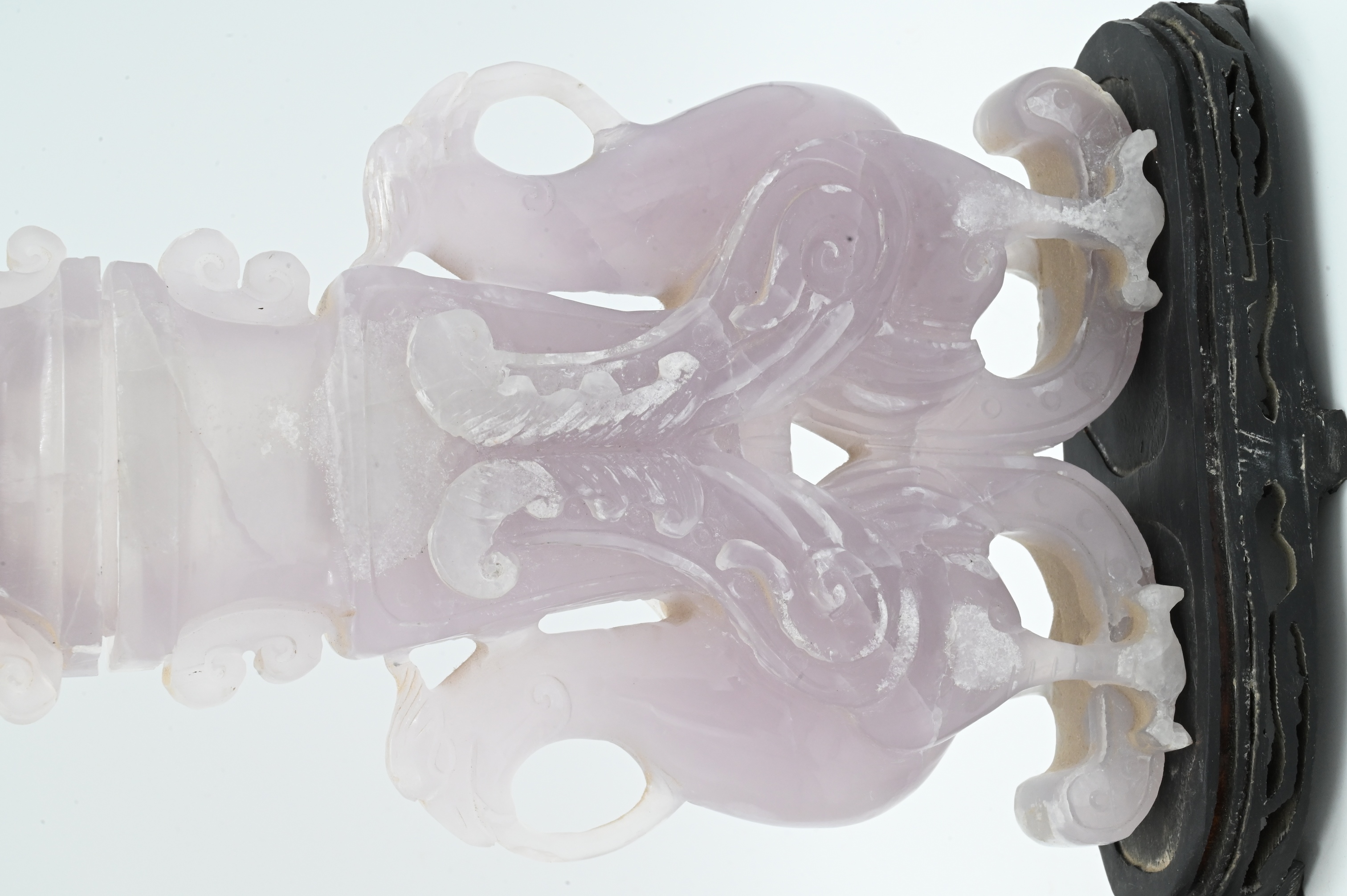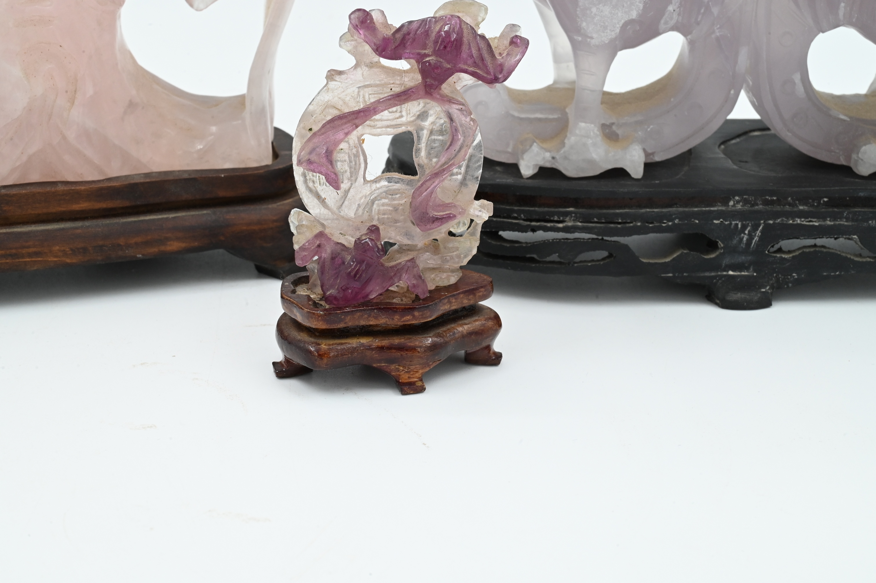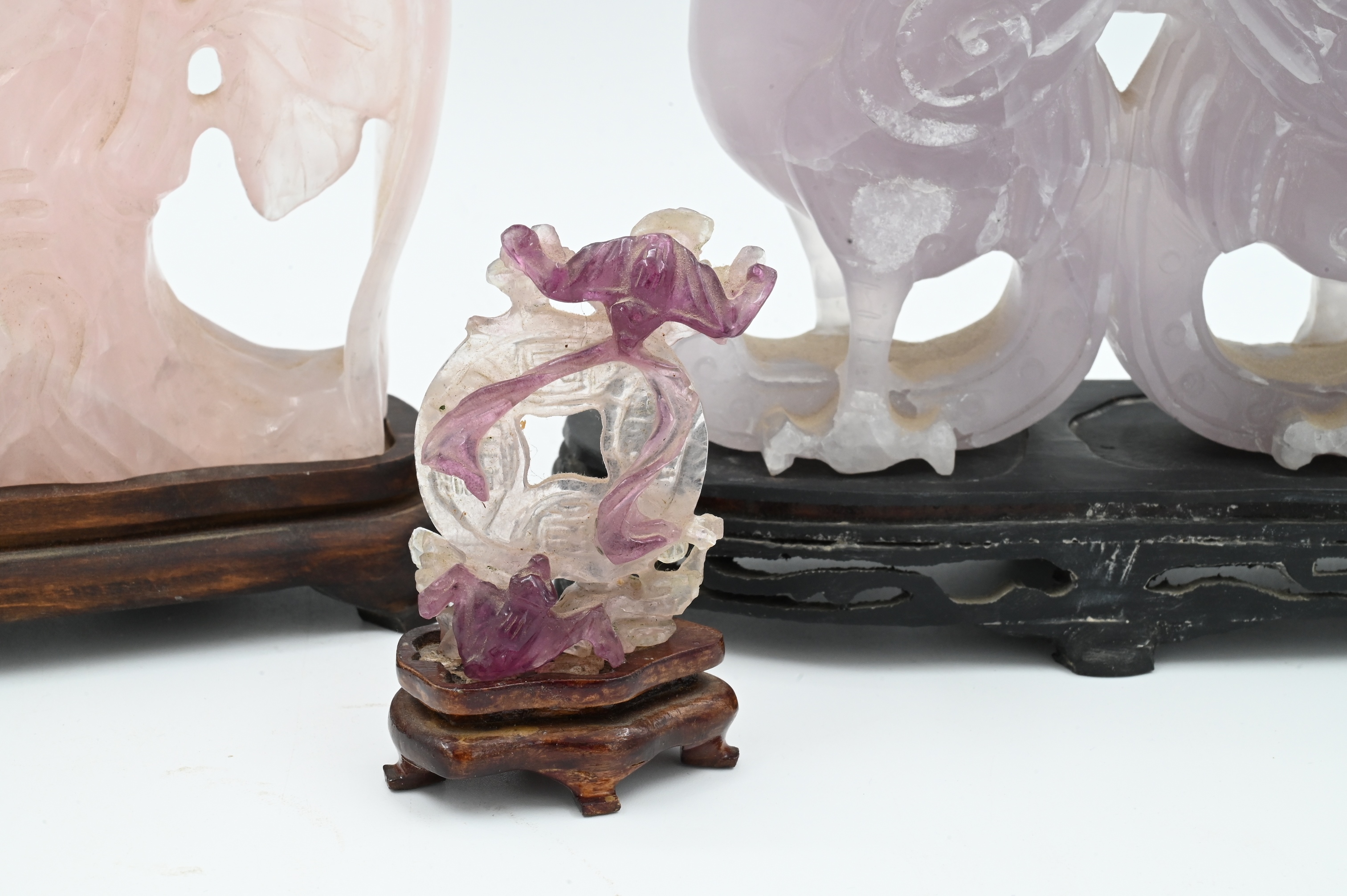 quarts height 10 inches, Chinese carved lavender quartz vessel supported by two griffin/phoenix birds and finial (broken) on wooden base height 11 1/2 inches, along with small carved hardstone piece of two bats circling a medallion length 2 1/2 inches