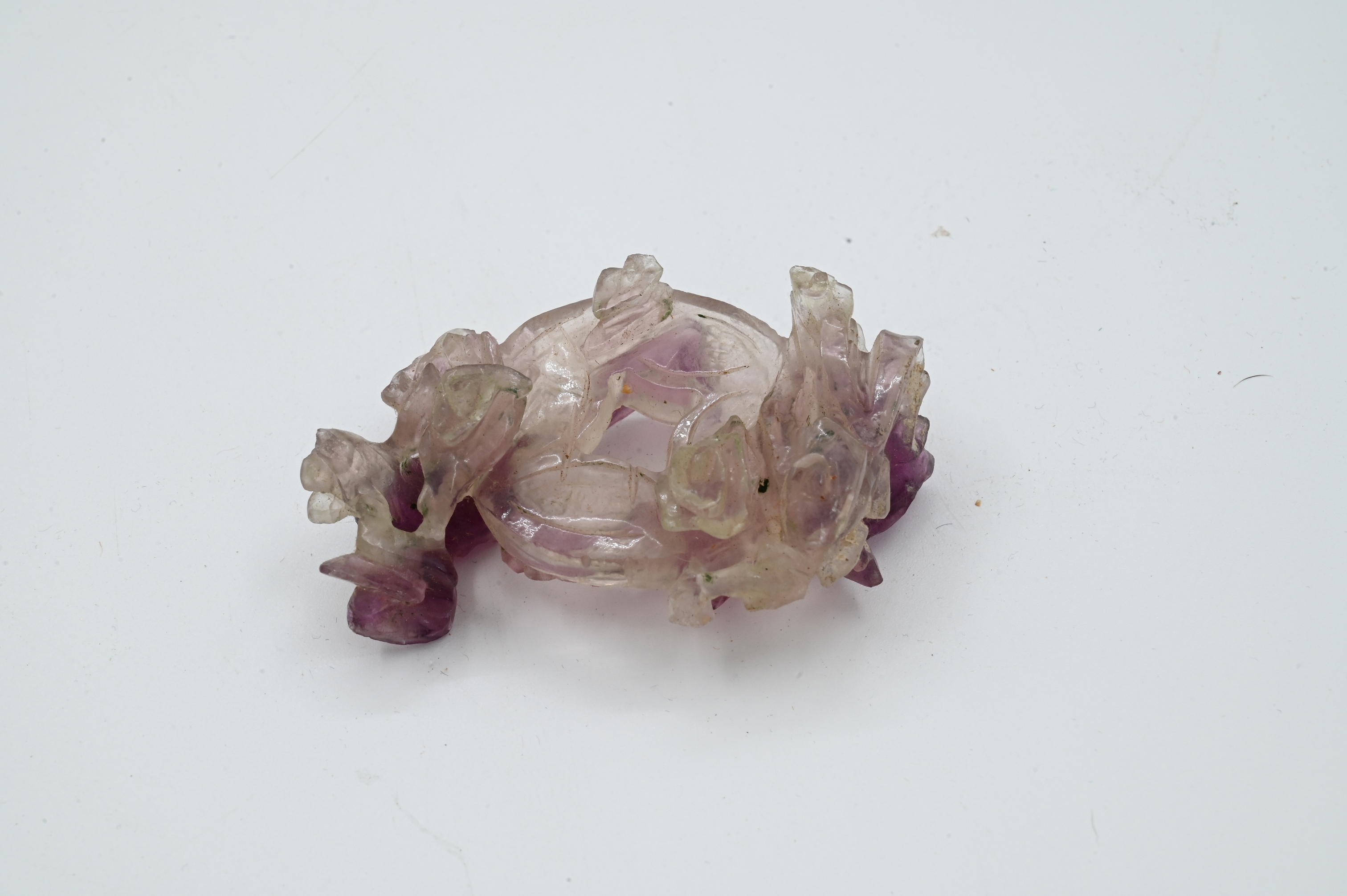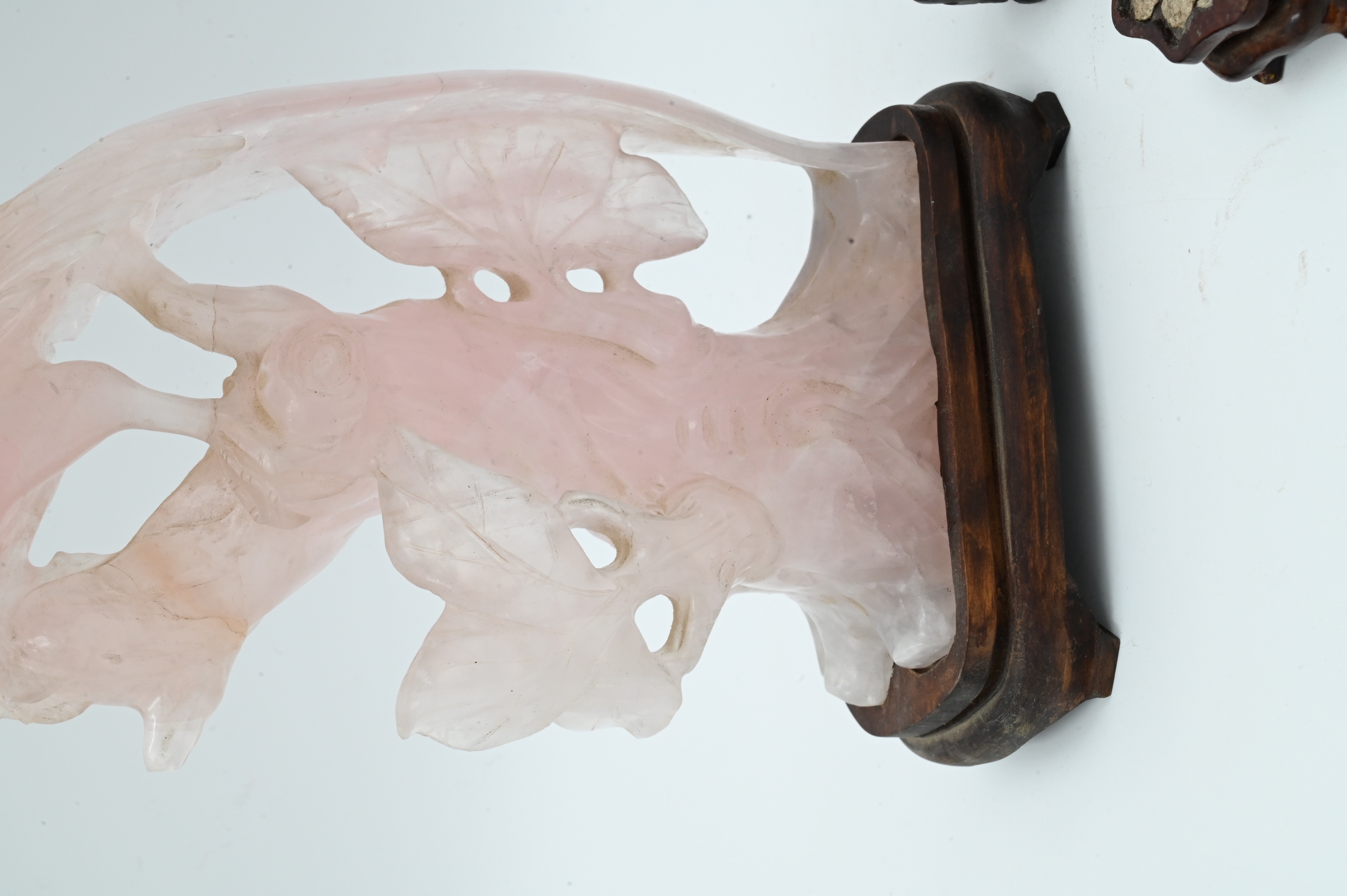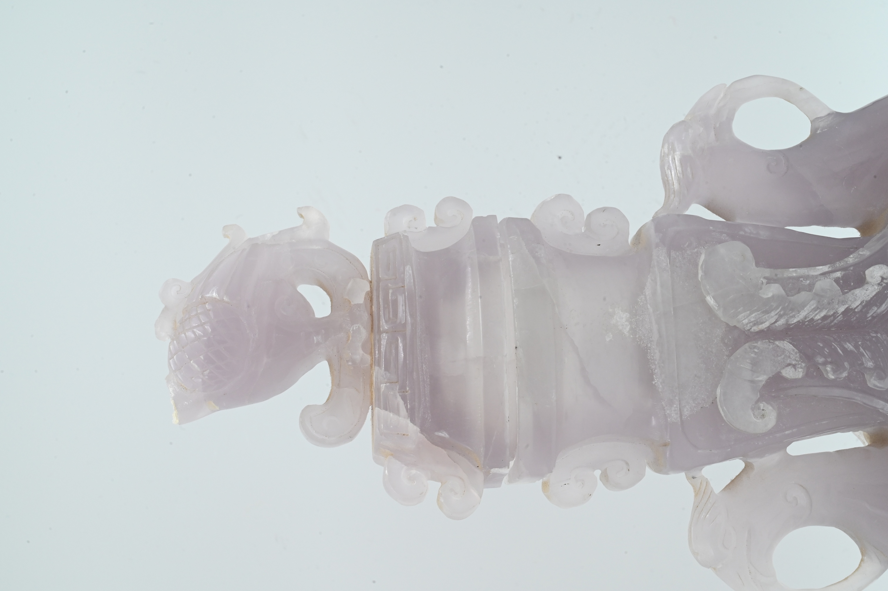 quarts height 10 inches, Chinese carved lavender quartz vessel supported by two griffin/phoenix birds and finial (broken) on wooden base height 11 1/2 inches, along with small carved hardstone piece of two bats circling a medallion length 2 1/2 inches