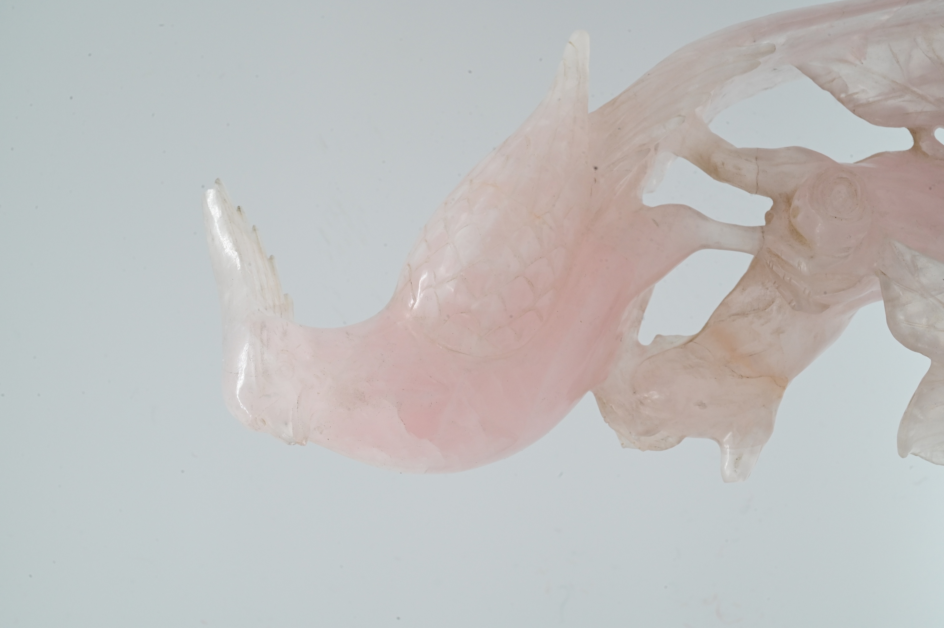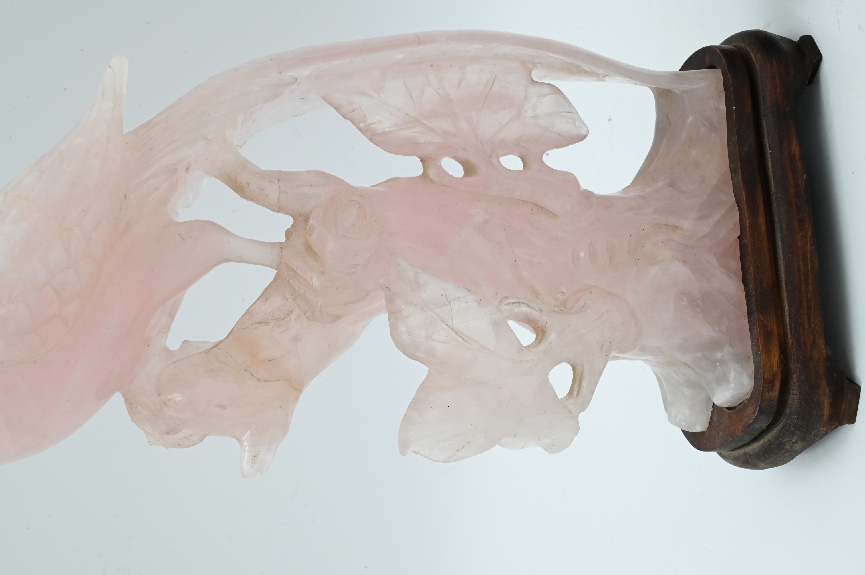 to include Chinese rose phoenix featuring a perched bird standing upon a tree branch set on wooden base