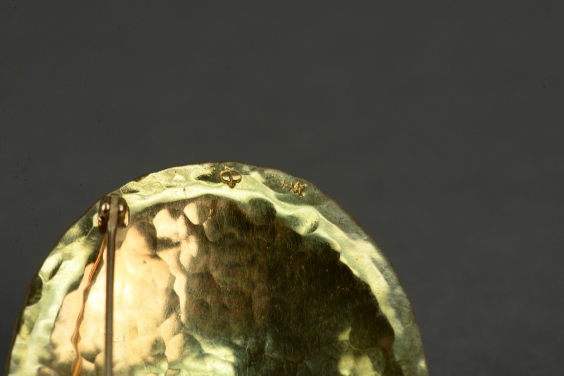 14K gold oval hand hammered brooch signed with a monogram by maker. 13 grams