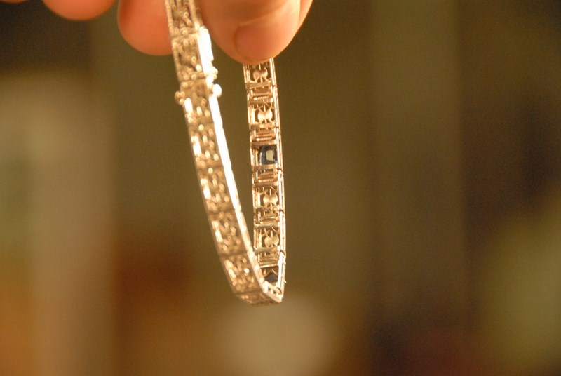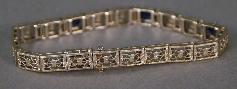 14k white gold filigree bracelet with three sapphires. 11 grams, lg. 6 3/4in.
