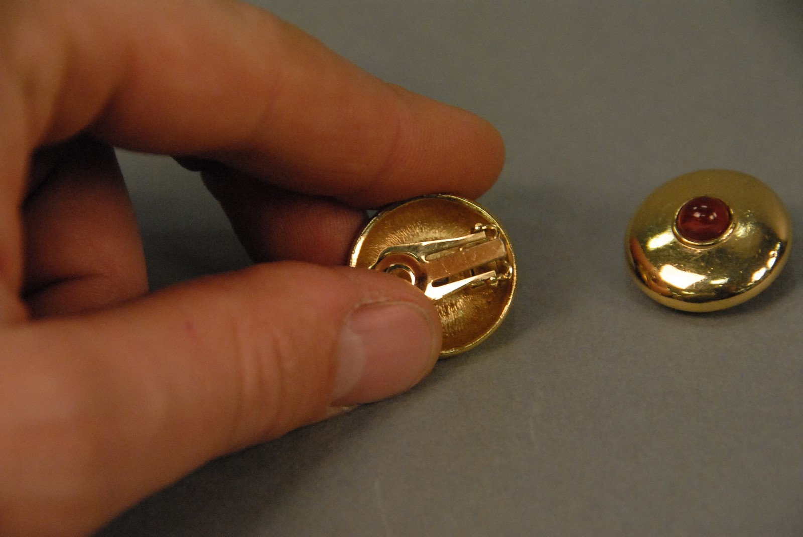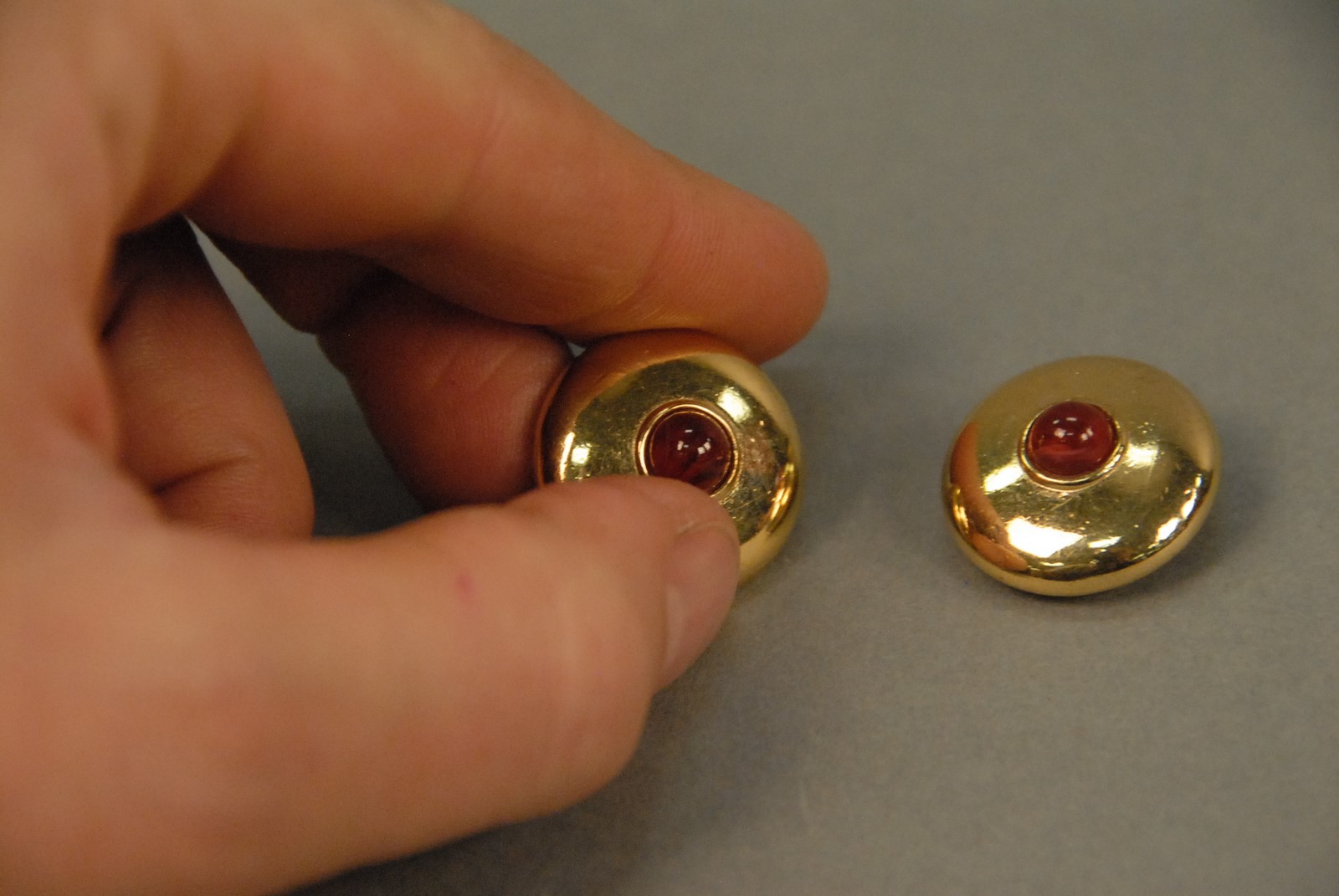 Lot 47: 14K yellow gold clip on earrings each with center cabochon cut ruby, 16.9 grams. Provenance: Property from The Estate of Margaret Reventlow of Litchfield, CT