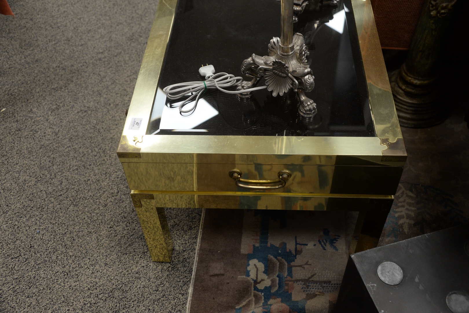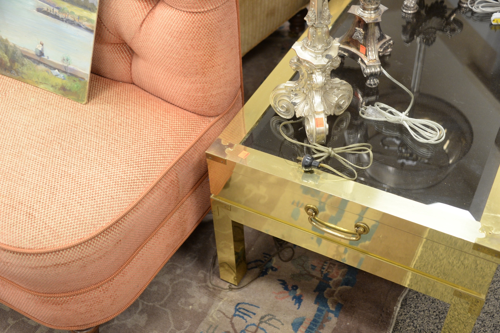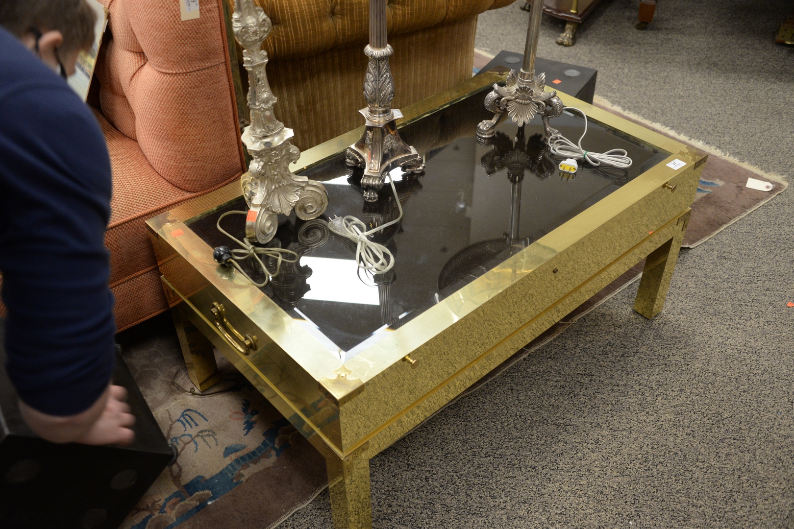 Brass Vitrine Coffee Table, having lift top and bevel glass, height 18 inches, top 40 x 23.