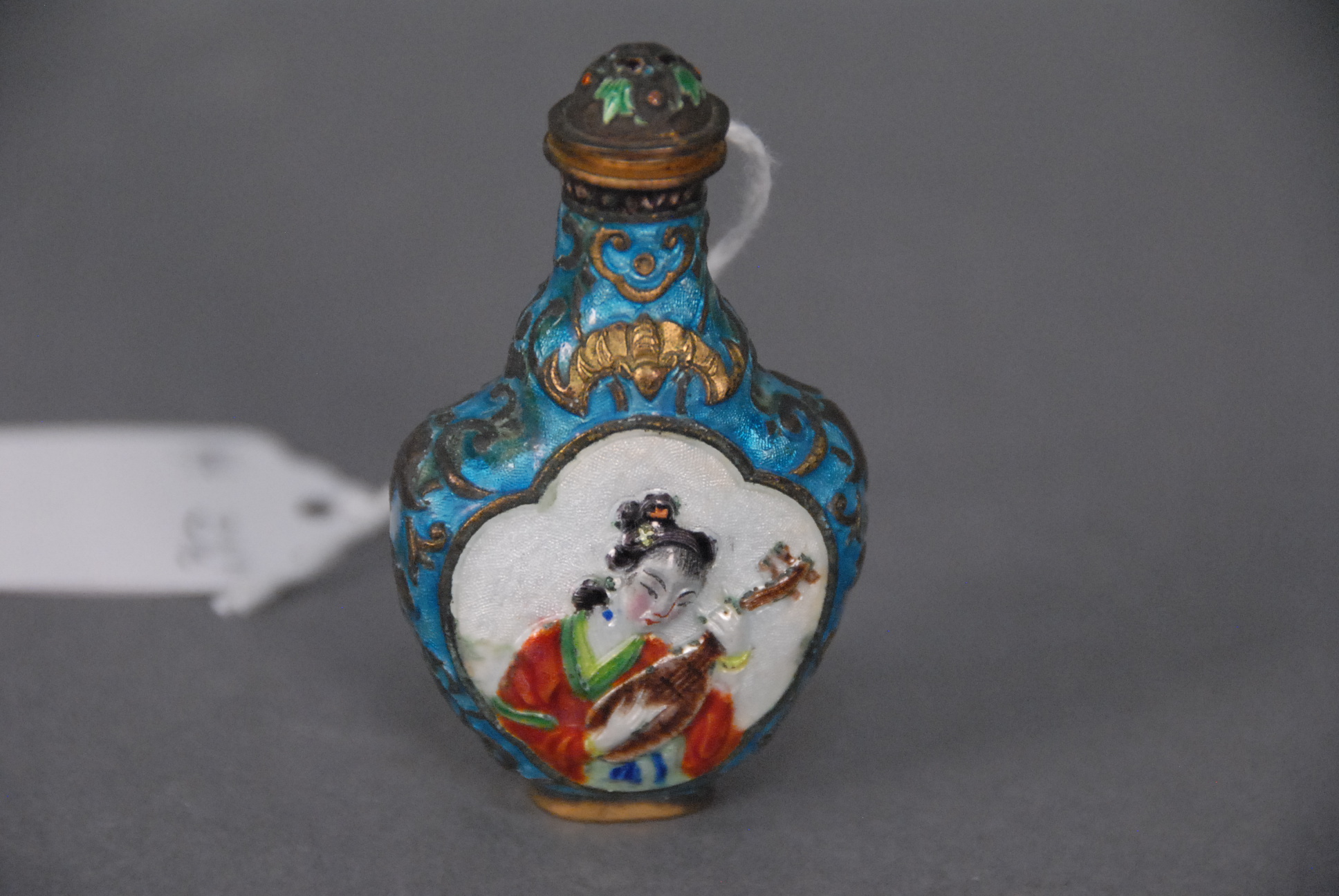 Cloisonn snuff bottle with panel having a girl playing an instrument, ht. 2 1/2in.