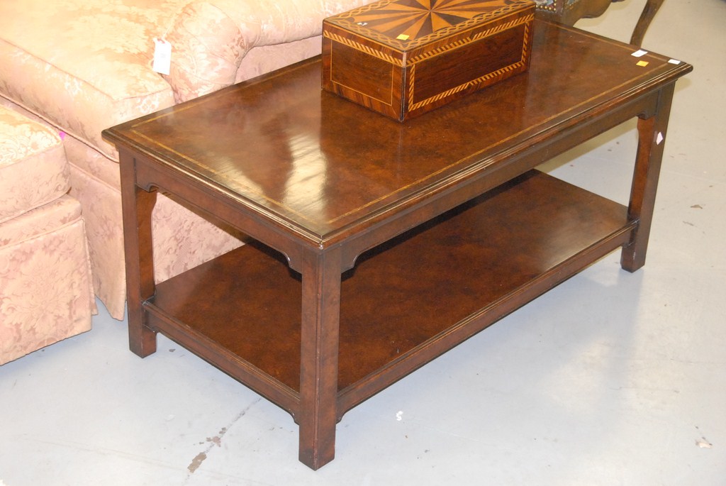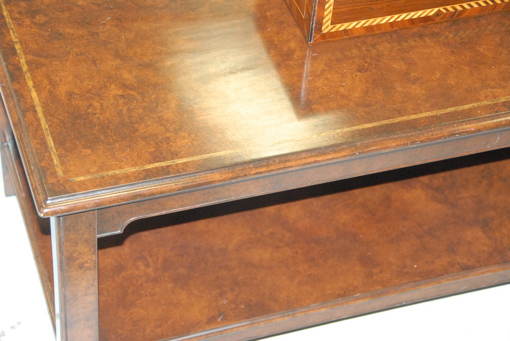 Contemporary burled coffee table, ht. 18, top: 21 x 40.
