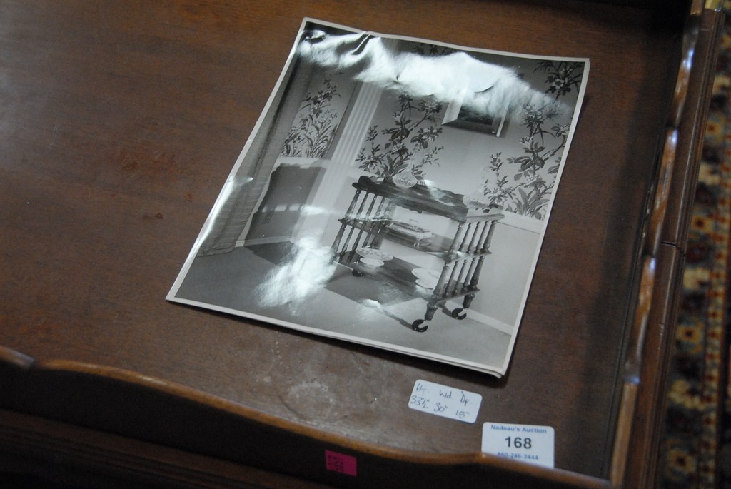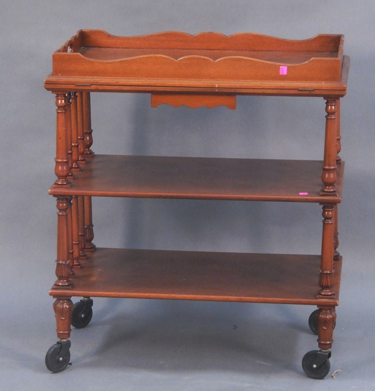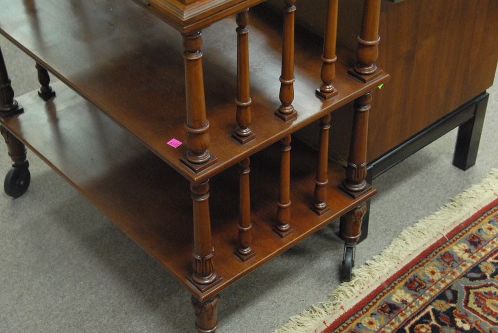 Lot 47: Custom mahogany serving cart with removable top tray and on wheels marked in photograph By Kaplan Furniture Company Newbury Hostess…