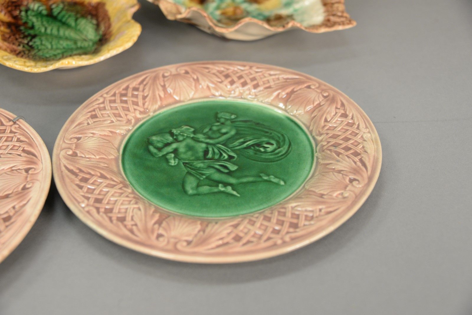 Eight pieces of majolica Sarreguemines majolica compote and plate, compote bowl with daisies by Griffin Smith & Hall, two Etruscan majolica classical plates, two Majolica leaf dishes, and a deco style compote. dia. 8 in. – 9 in.