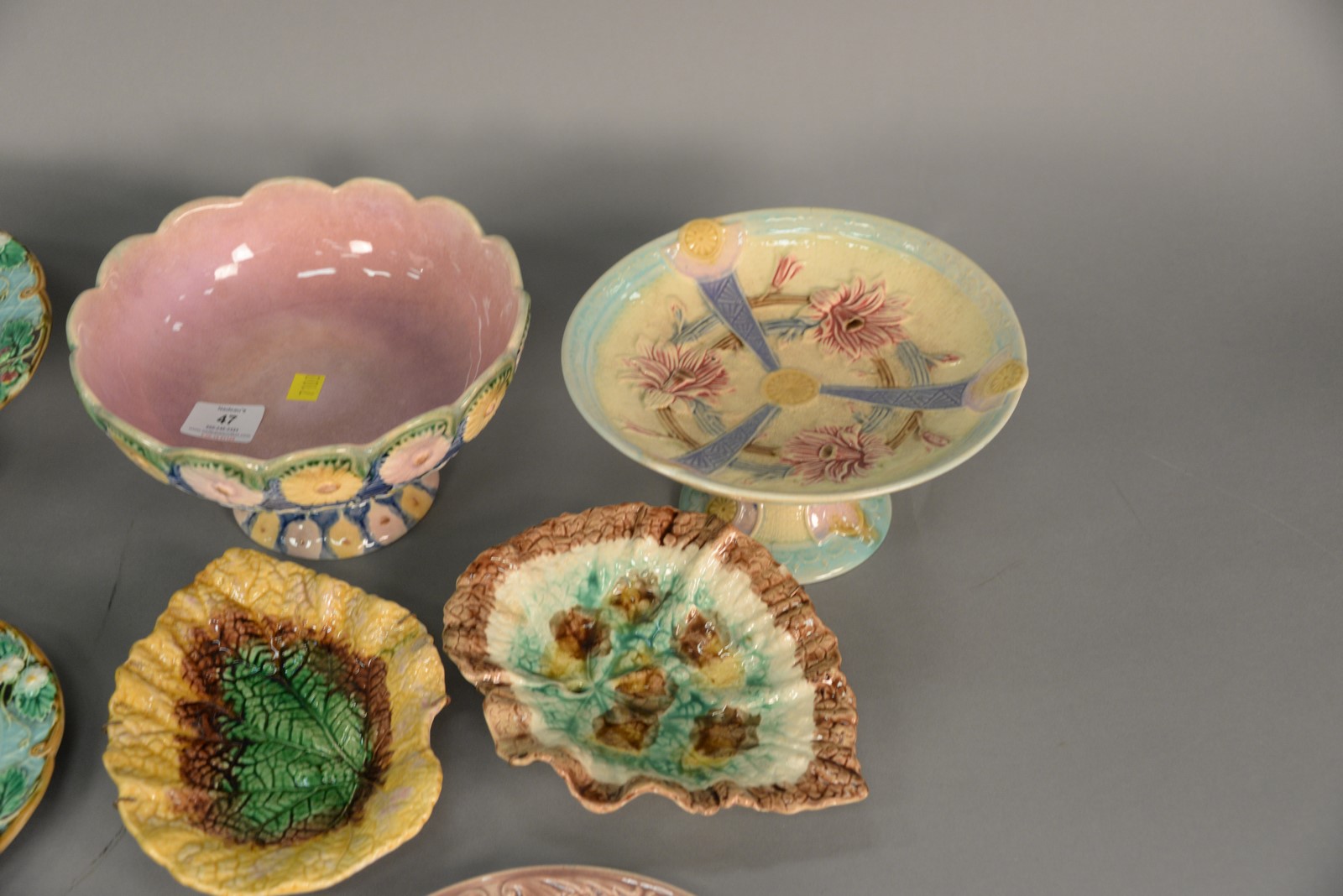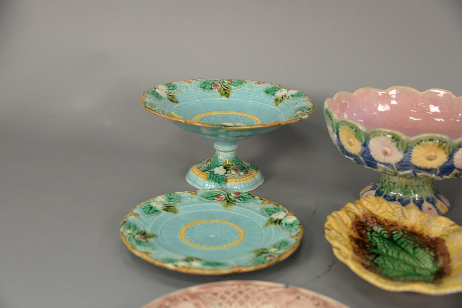 Lot 47: Eight pieces of majolica Sarreguemines majolica compote and plate, compote bowl with daisies by Griffin Smith & Hall, two Etruscan m…