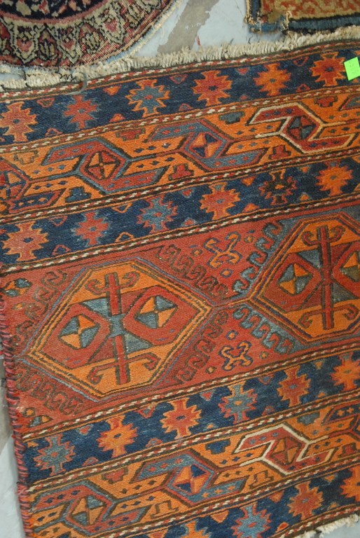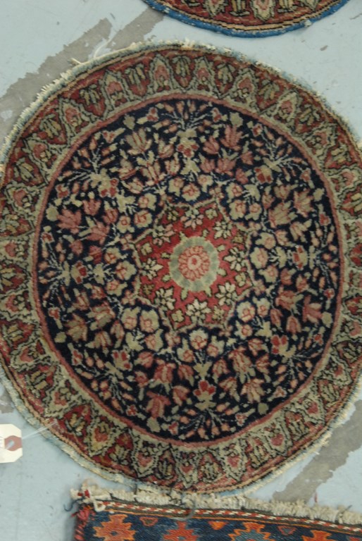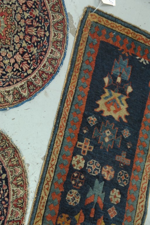 Lot 47: Four piece Oriental rug lot to include two round, soumac bag face, and short runner cut. dia. 1’5, dia. 1’5, 1’7 x 1’9, & 1’2…