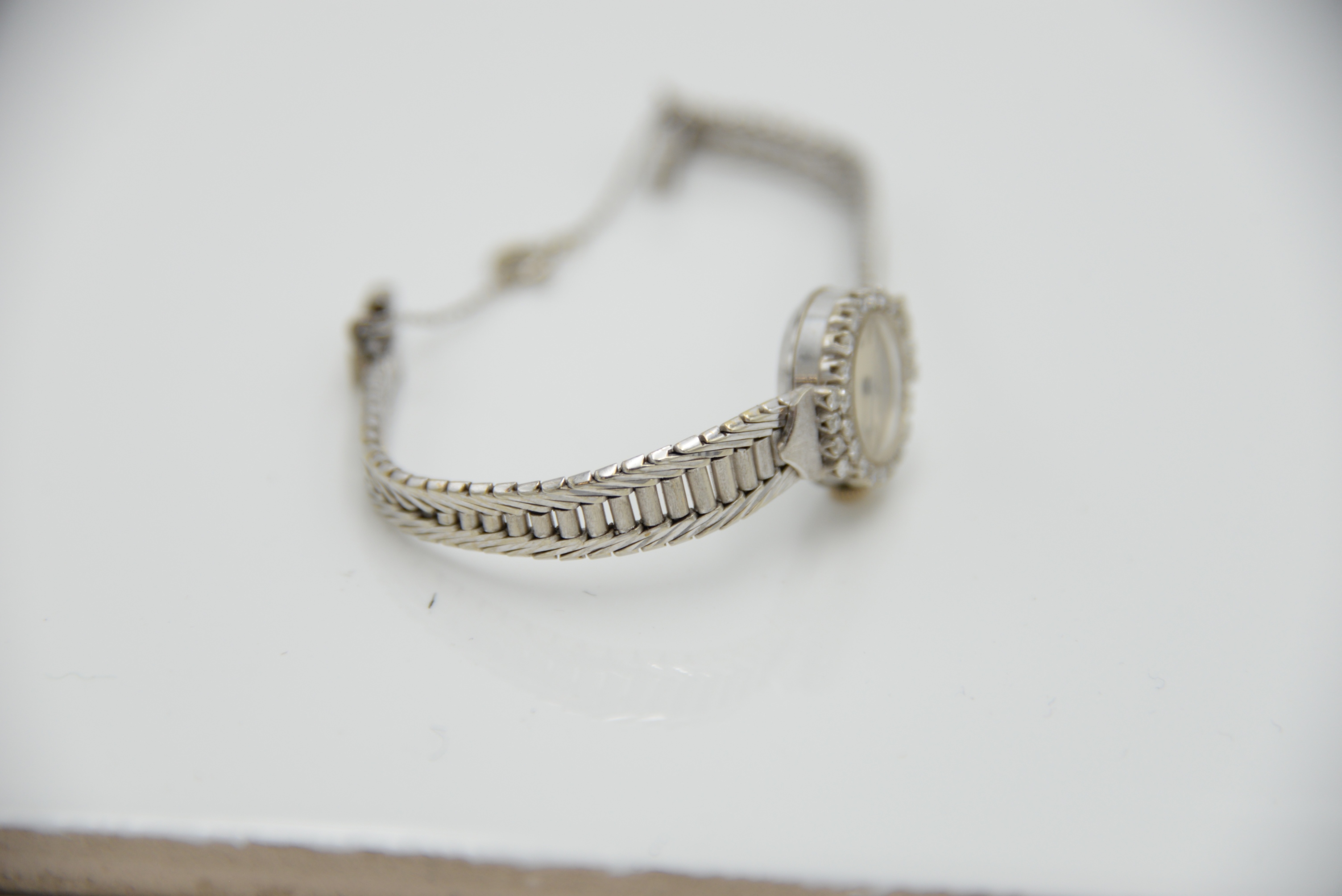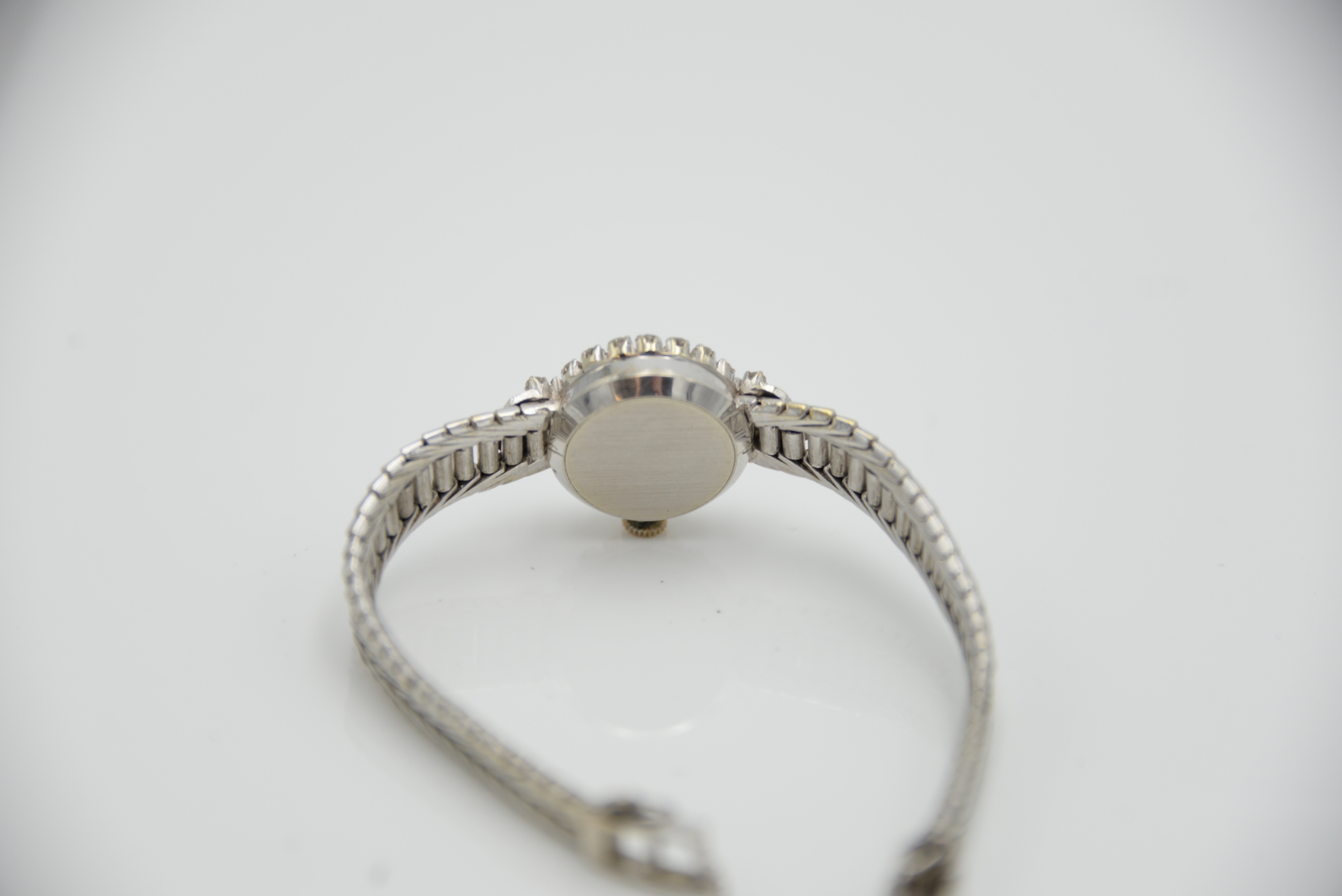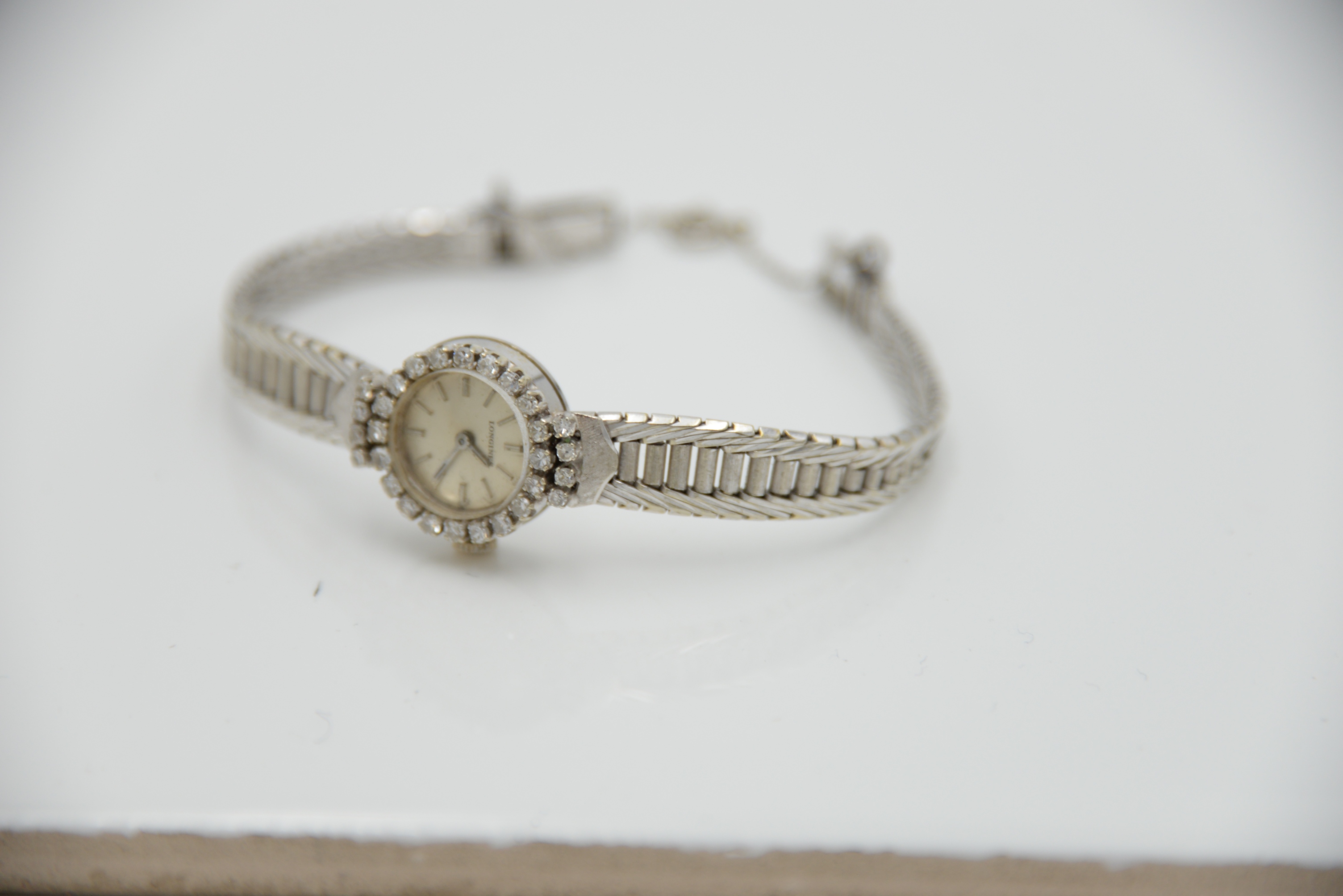 Longines 18 Karat White Gold Ladies Wristwatch having diamond surround 18 karat yellow gold bracelet length 6 3/4 inches, 26.9 grams total weight.