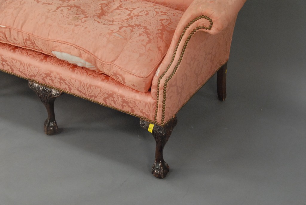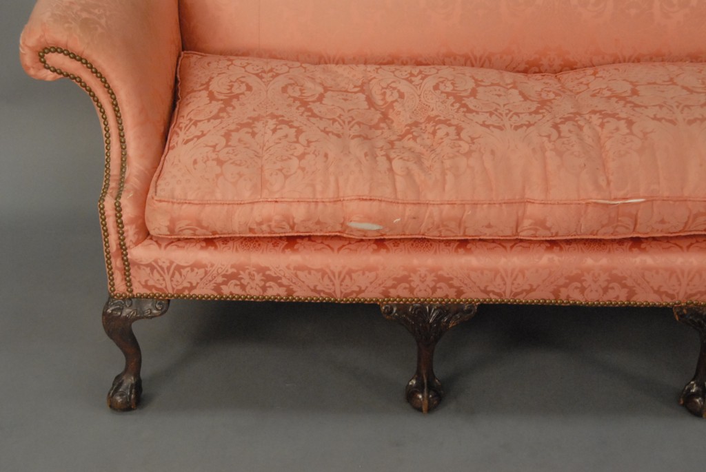 Mahogany Chippendale style camel back sofa with carved ball and claw feet.