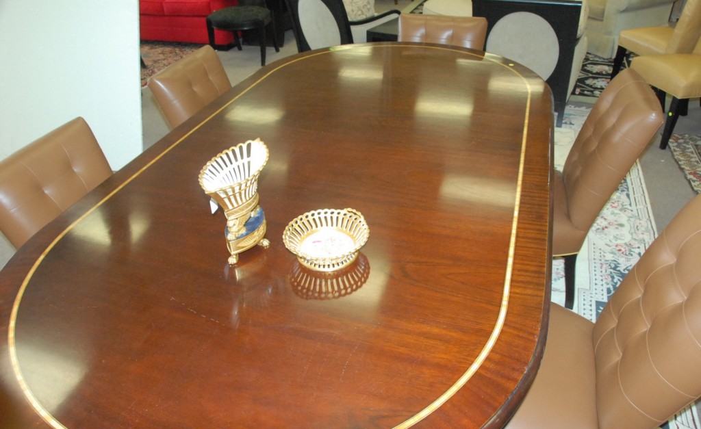 Mahogany oval conference table with line inlay and double pedestal base, 31 x 8′.