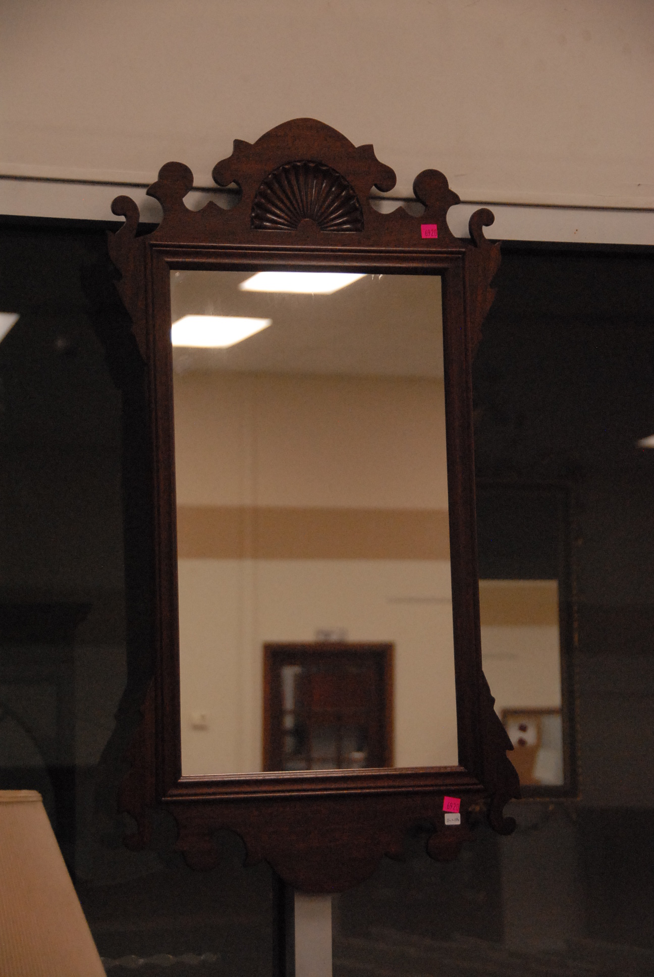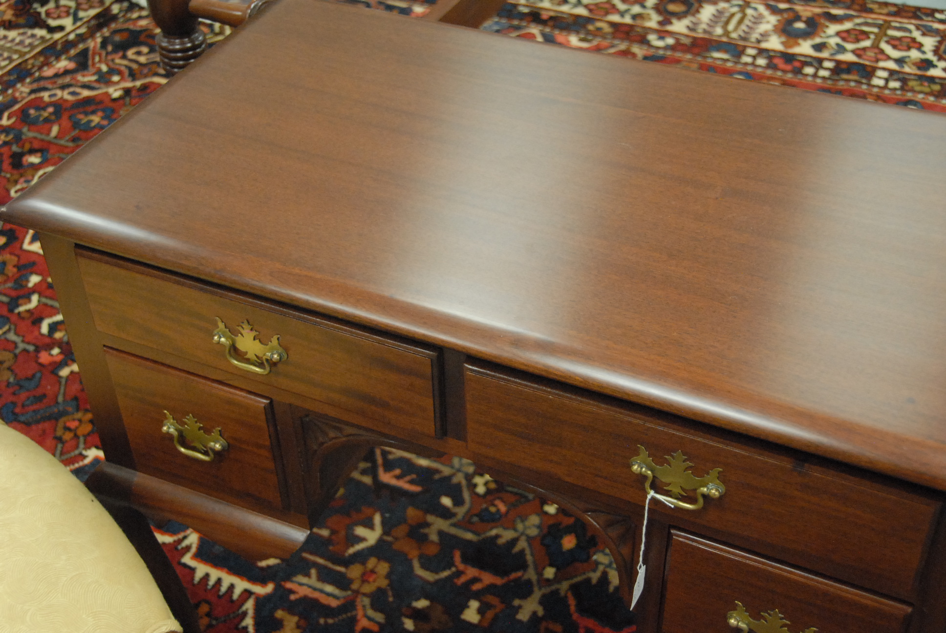Mayflower Furniture Co. mahogany vanity and mirror along with French style chair. vanity: ht. 30in. dp. 20in.