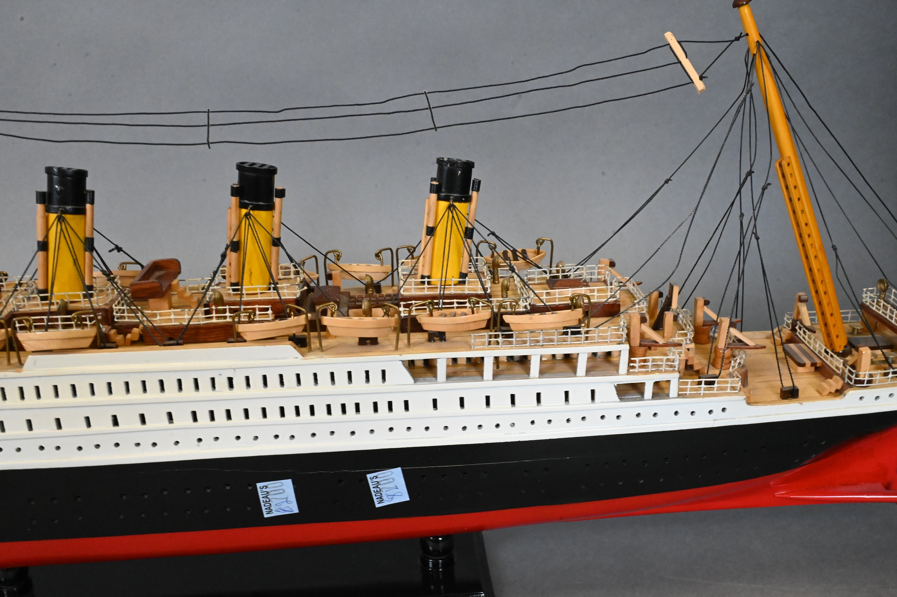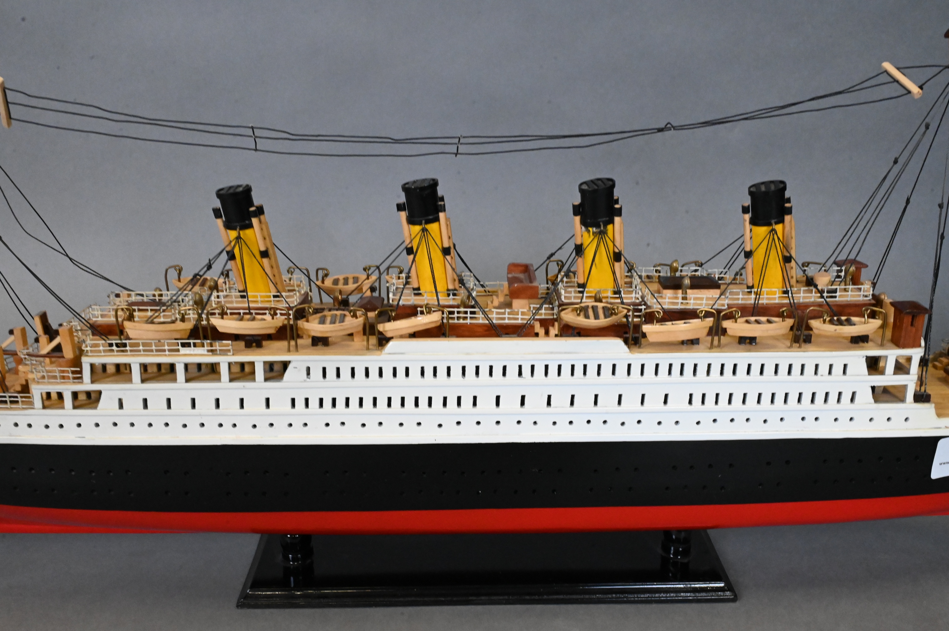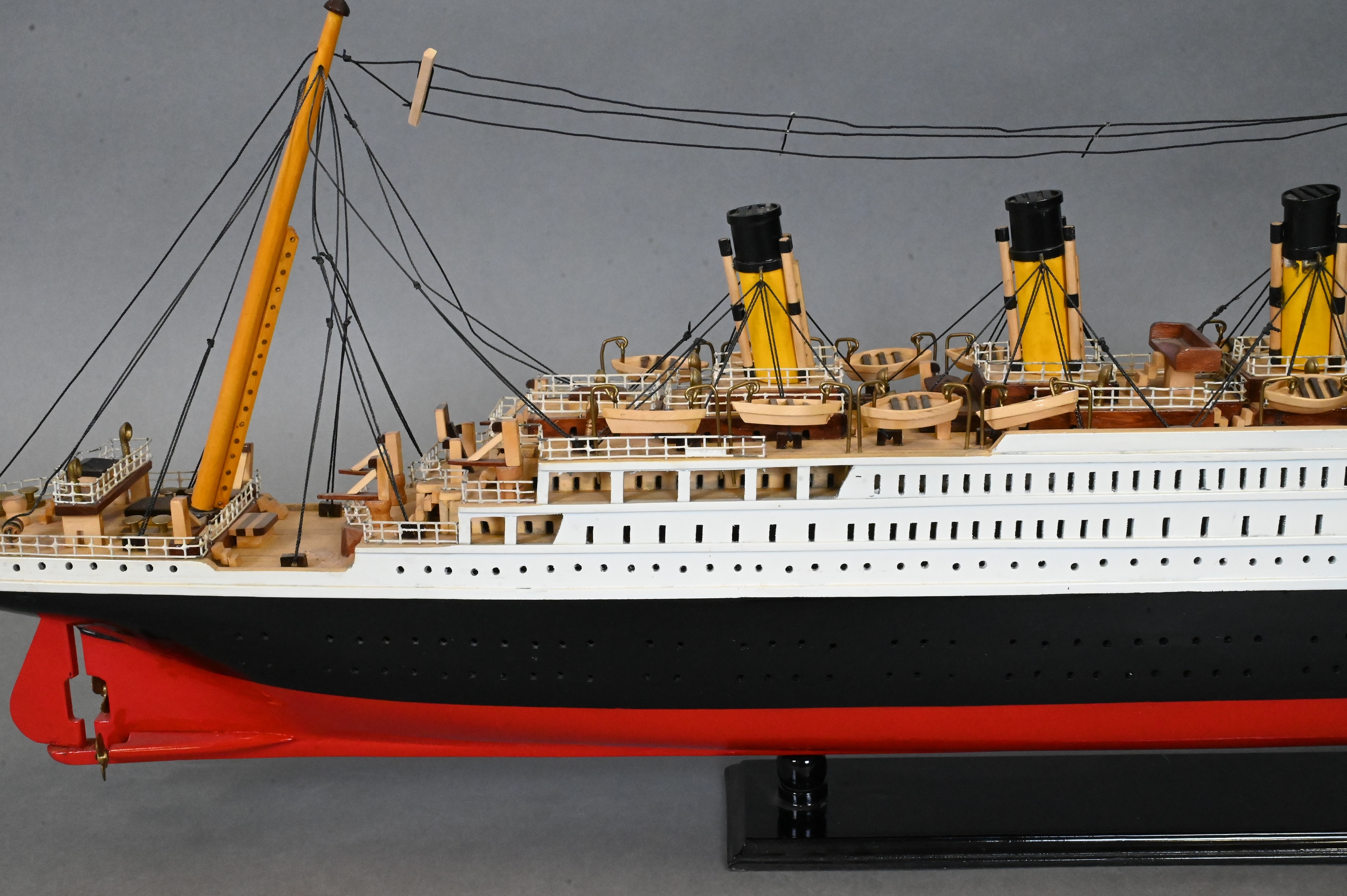 Carved and painted wood complete with lifeboats, spinning propellers, pulleys