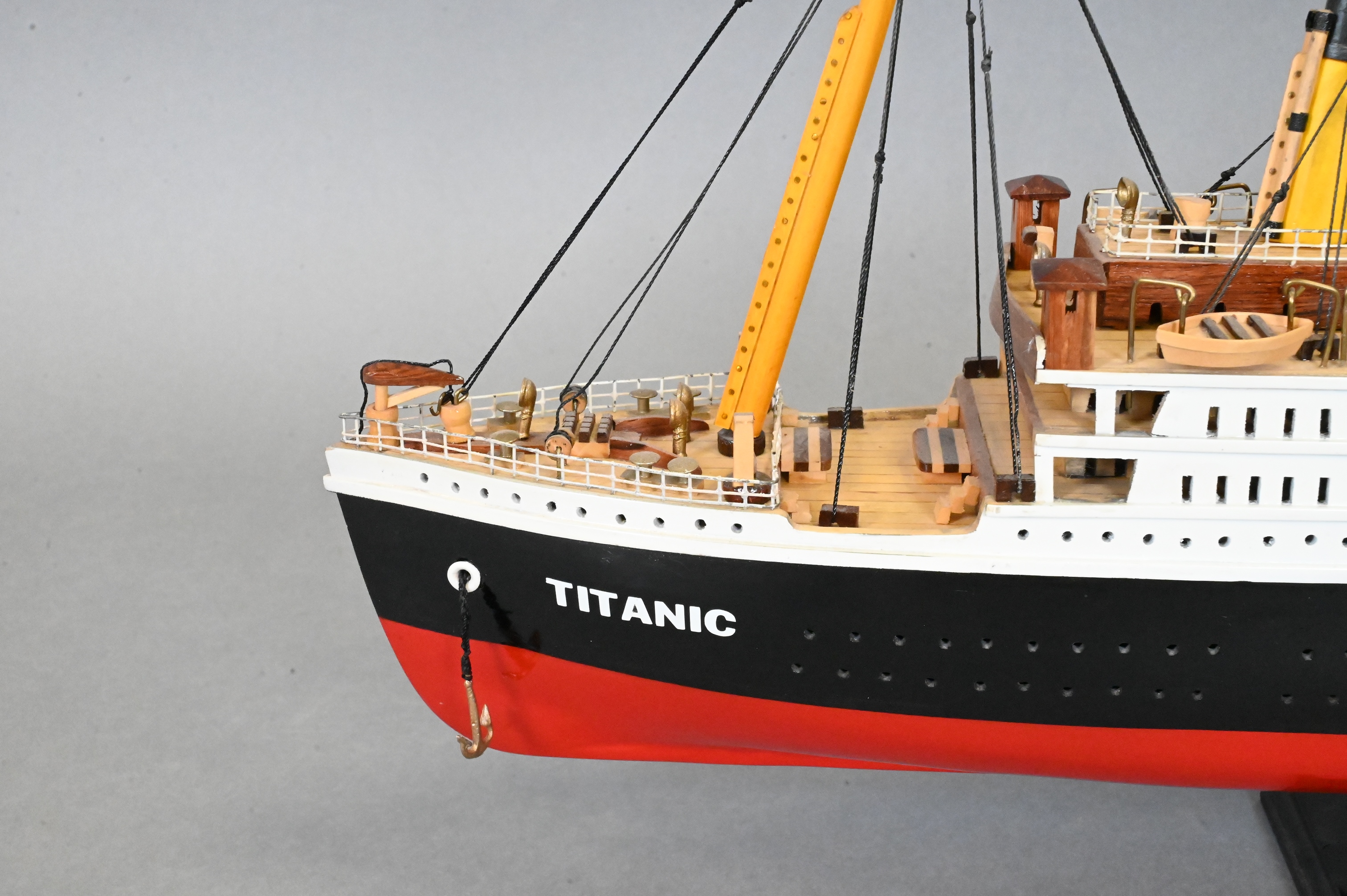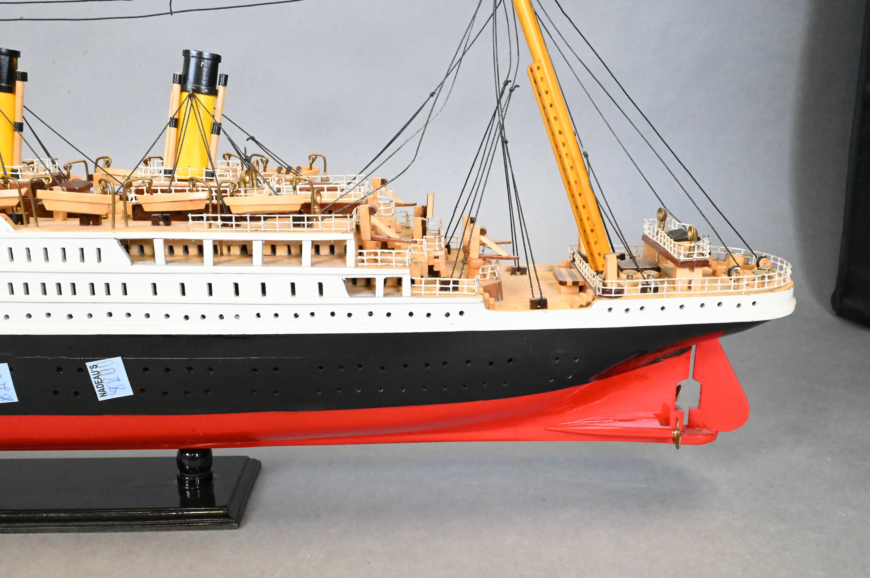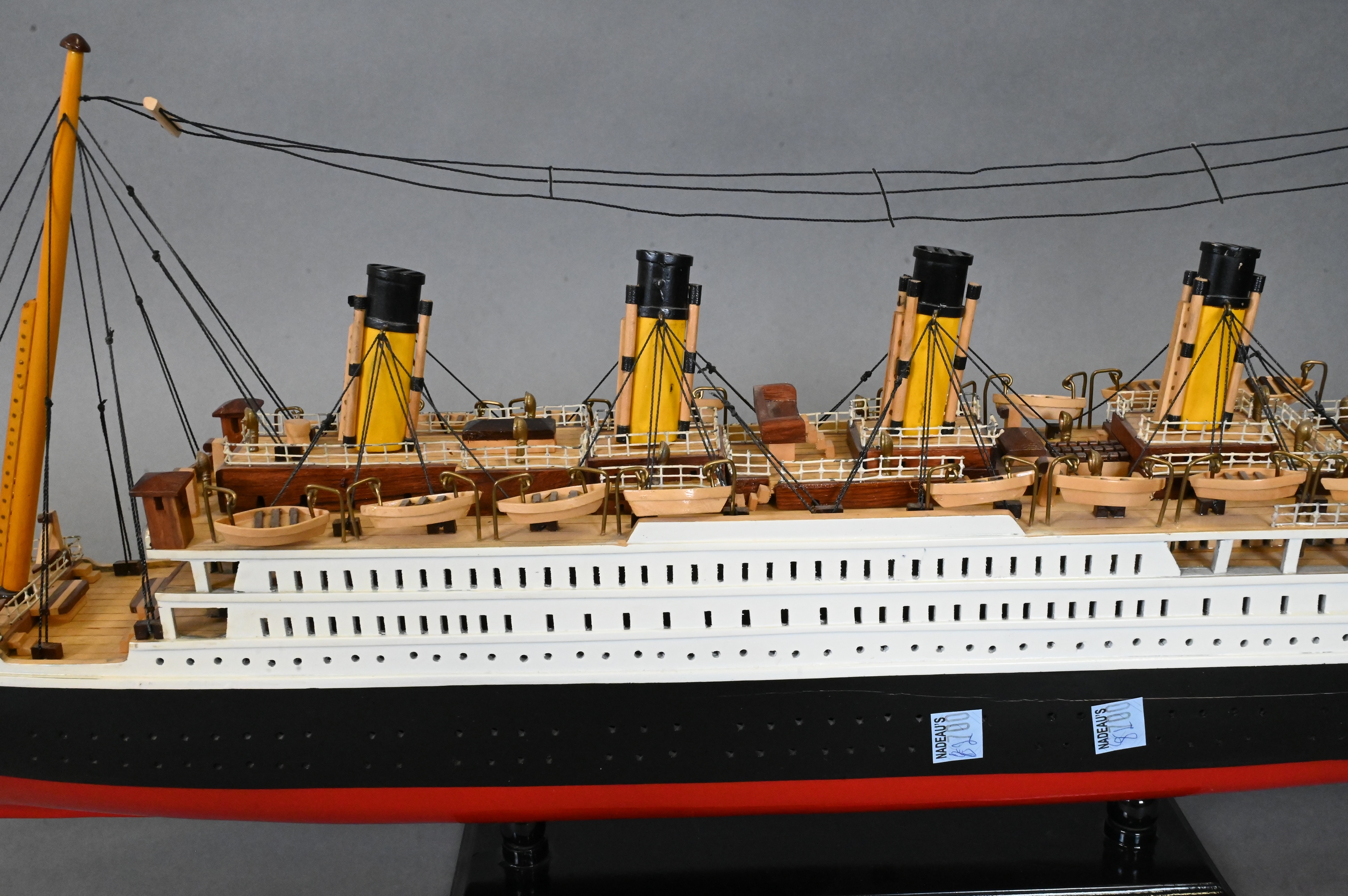 Carved and painted wood complete with lifeboats, spinning propellers, pulleys