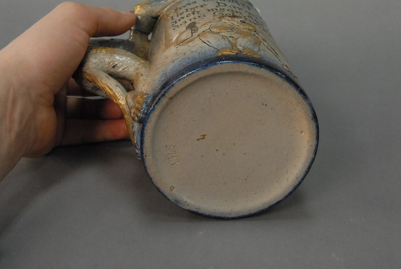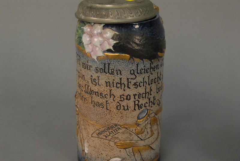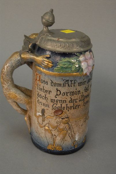 Lot 47: Sarreguemines Student Monkey stoneware stein with monkey handle, 1.0L marked 2717 with pewter lid. ht. 9in.