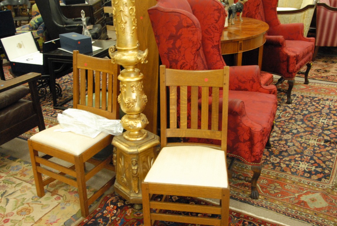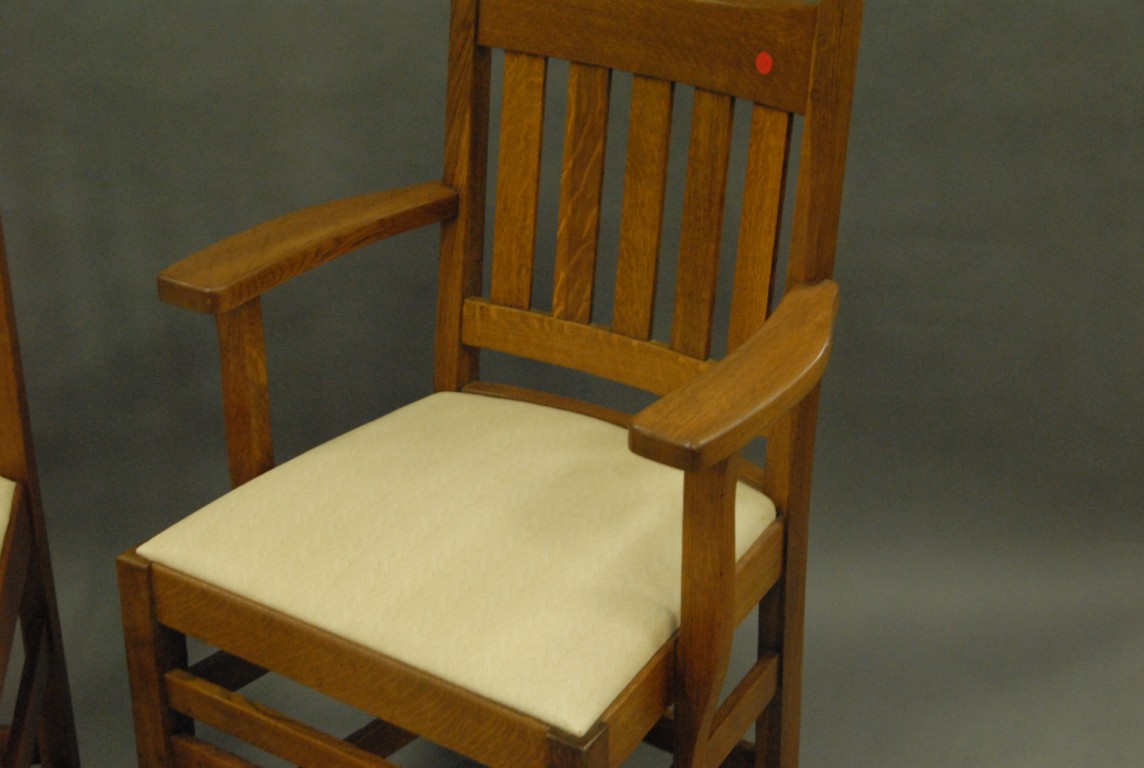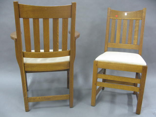 Set of six oak Arts and Crafts dining chairs signed Limberts, one arm and five side