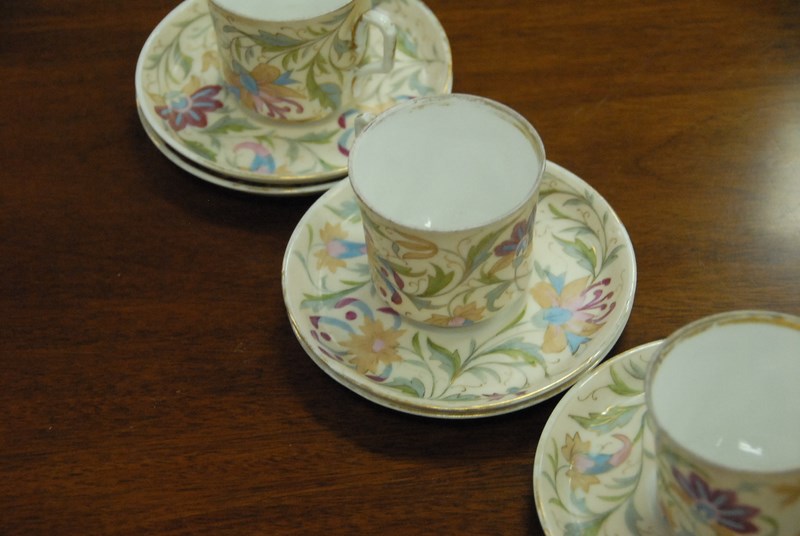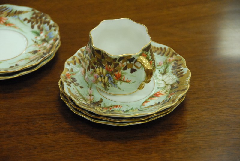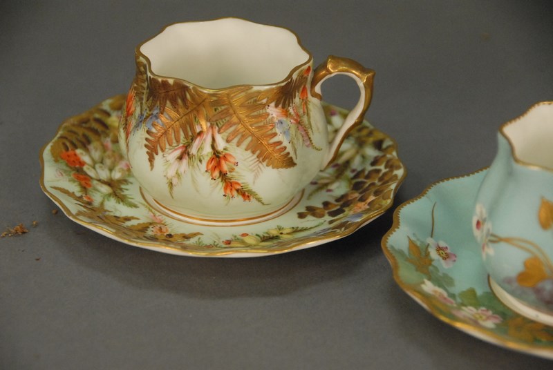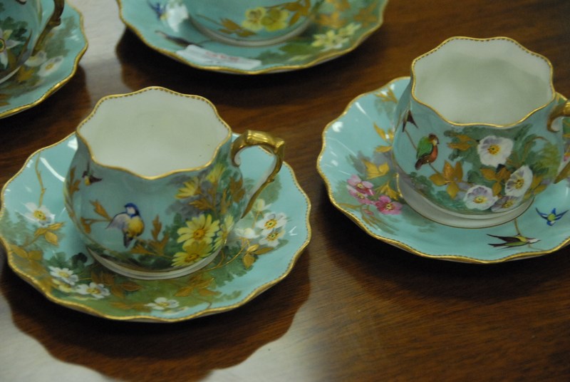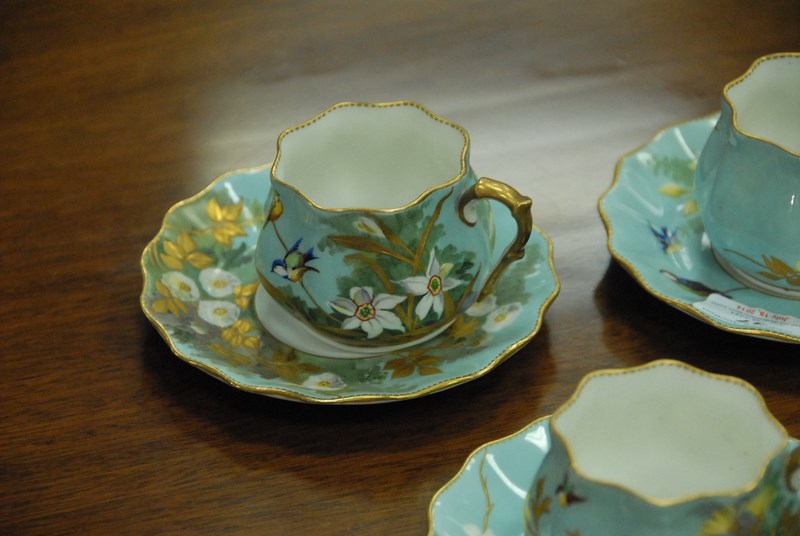 Lot 47: Seven cups and saucers, two patterns with birds, flowers, and high relief gold marked Burslem and four other painted cups and saucers.