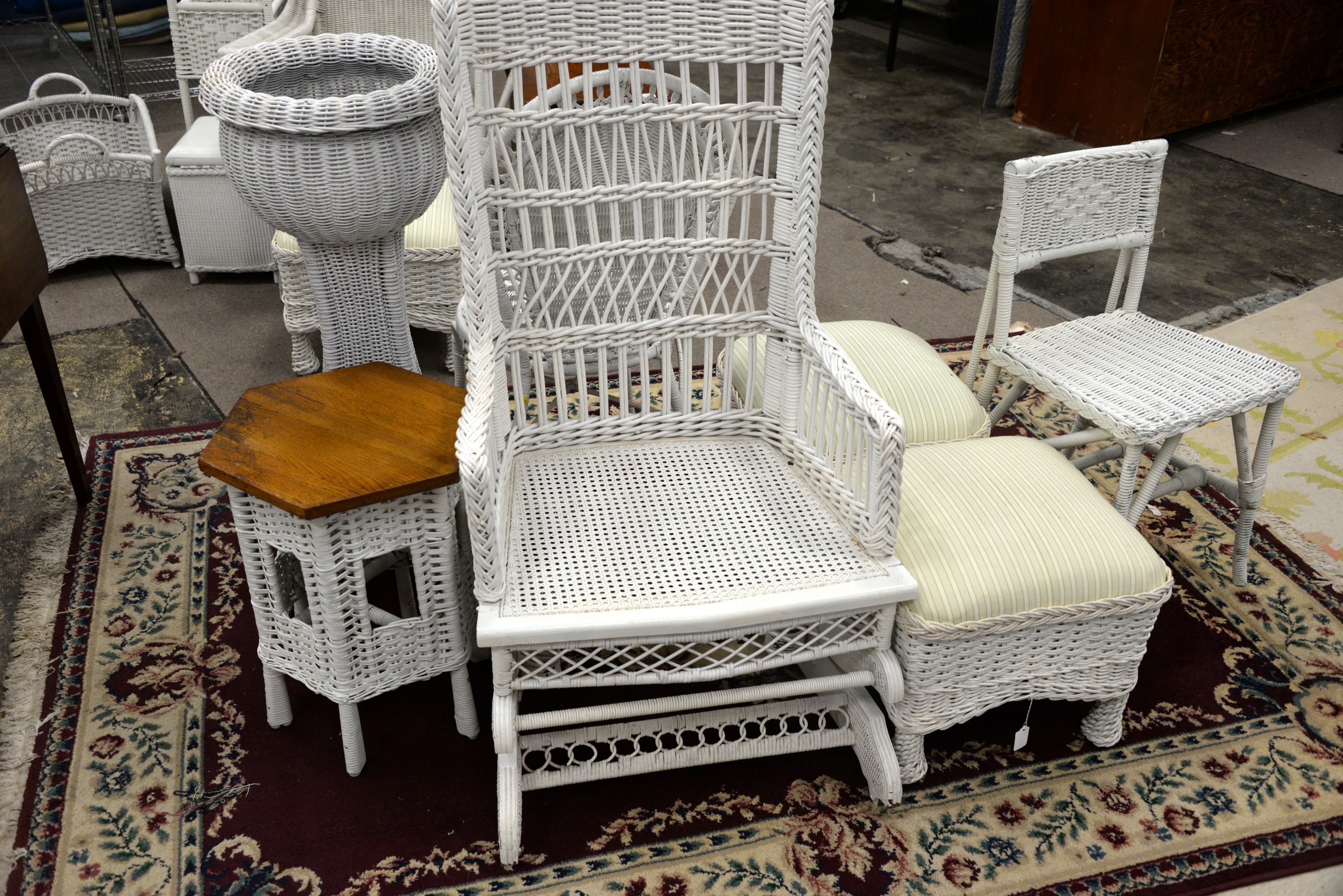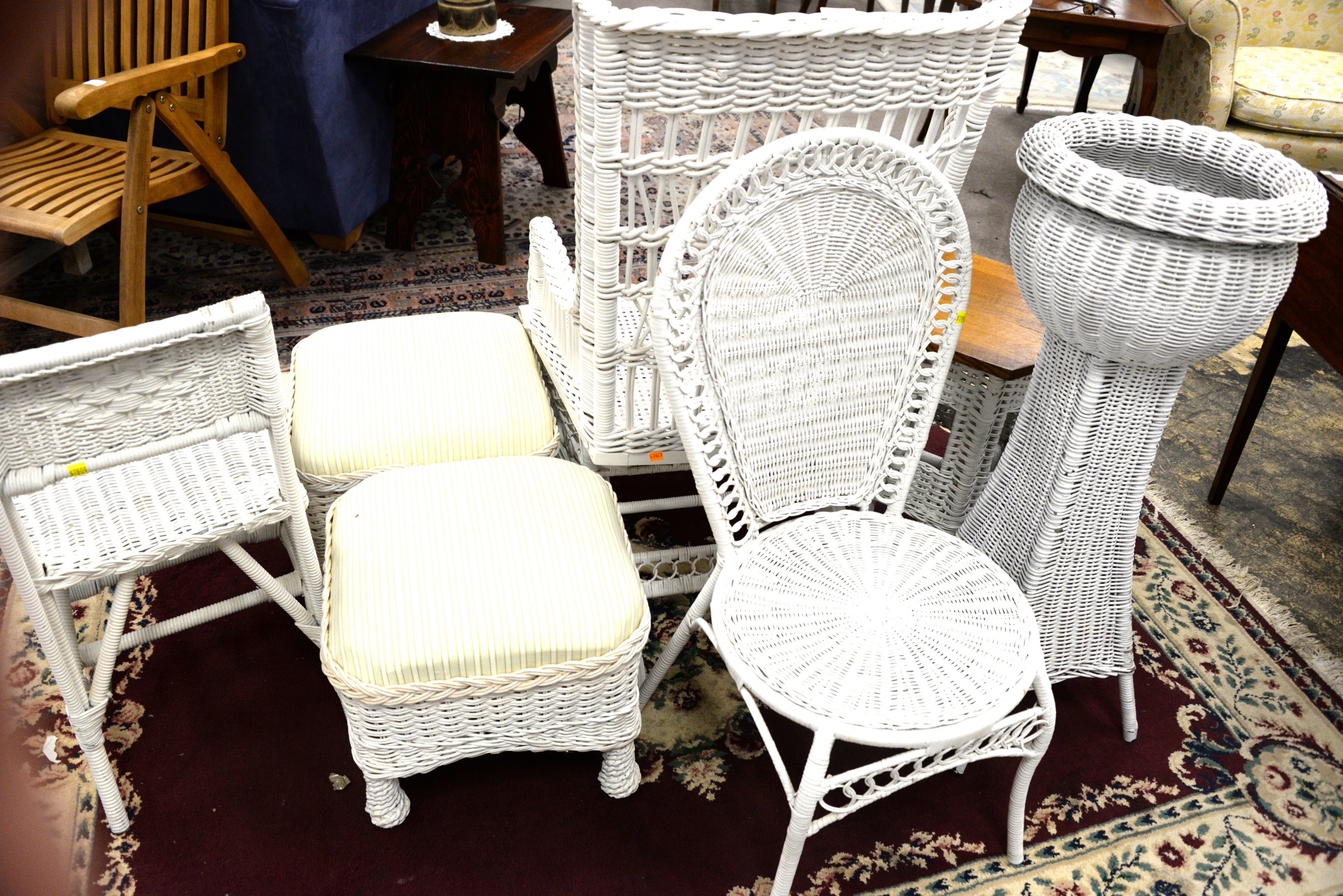 Lot 47: Seven piece wicker lot including rocker, chair, two footstools, table, and two plant stands.