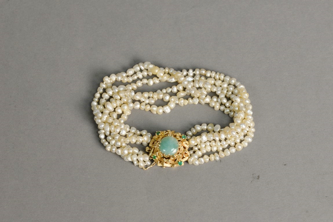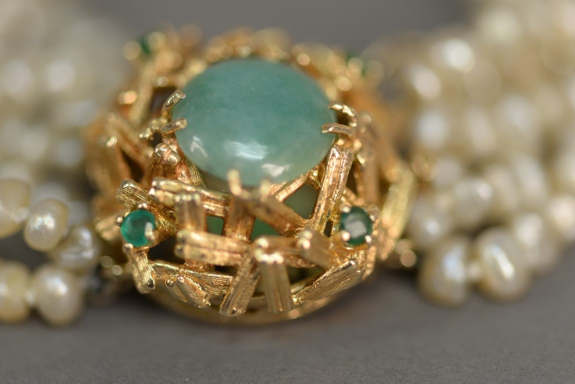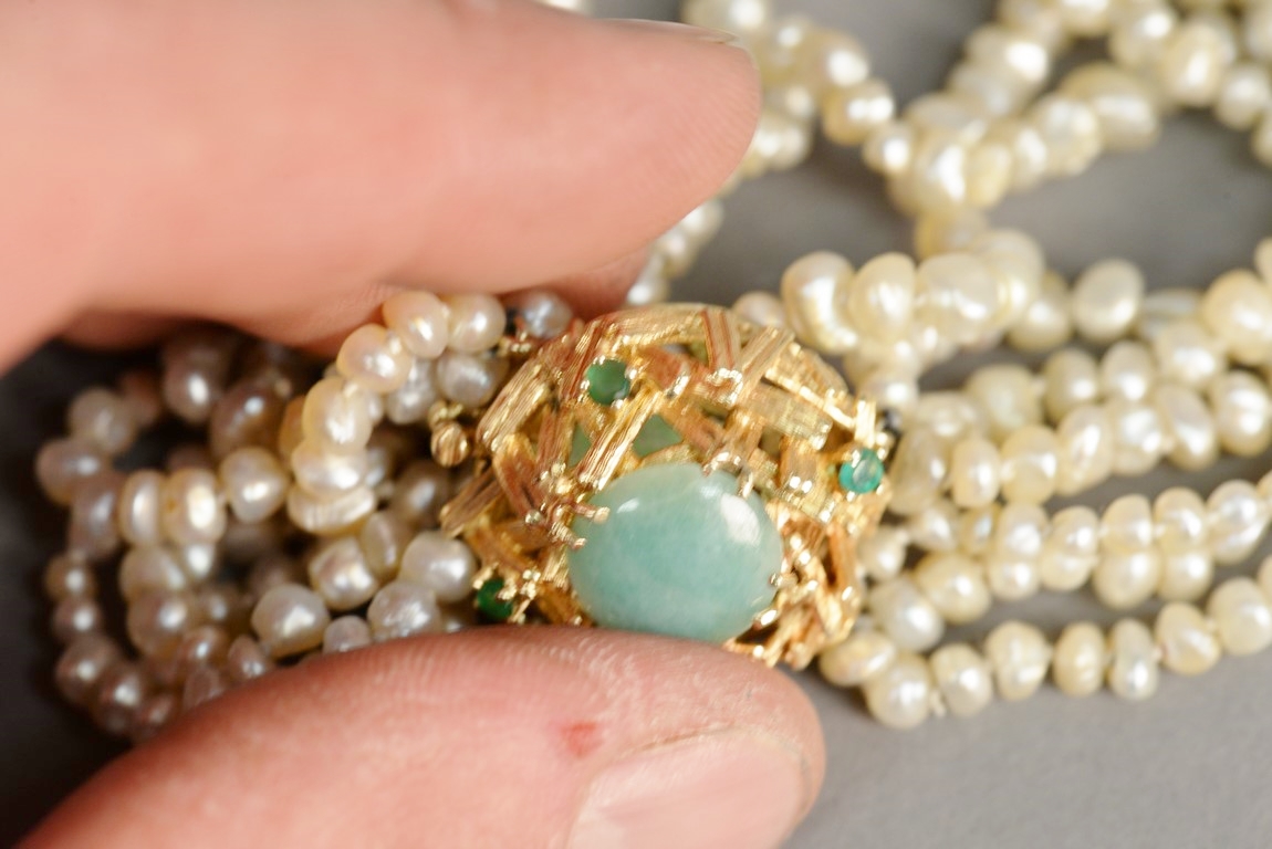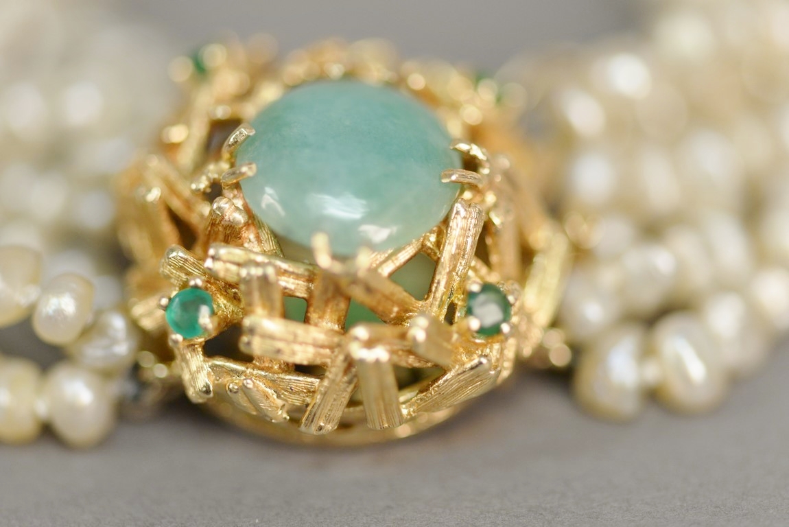 Lot 47: Six row Torsade style fresh water cultured pearl bracelet with 14K gold clasp mounted with jade and chrysoprase, marked ABF.
