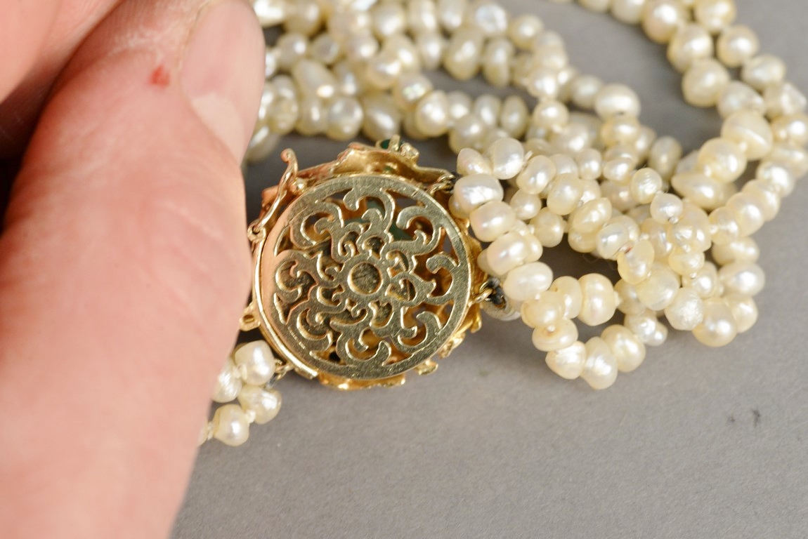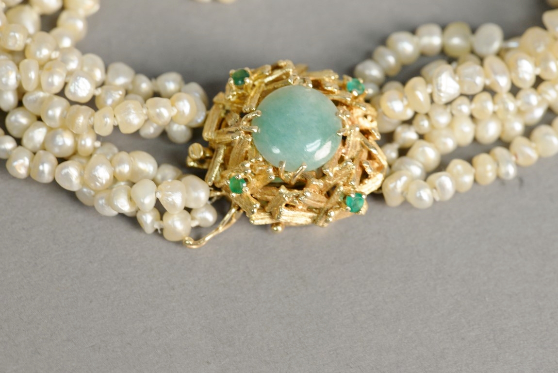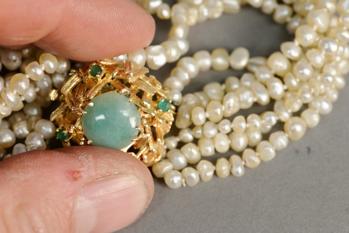Six row Torsade style fresh water cultured pearl bracelet with 14K gold clasp mounted with jade and chrysoprase, marked ABF.