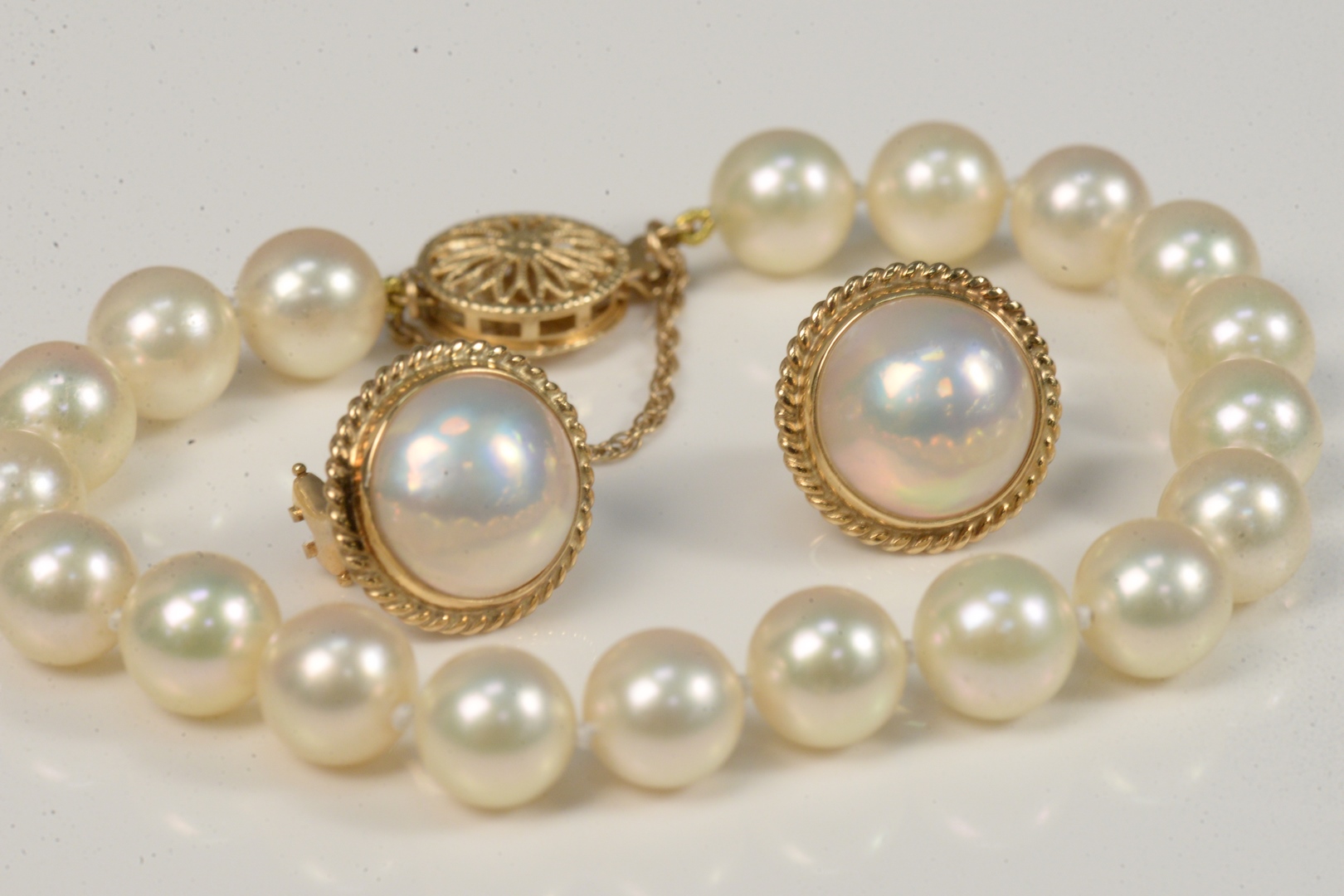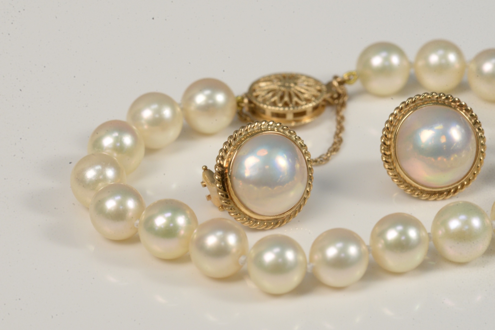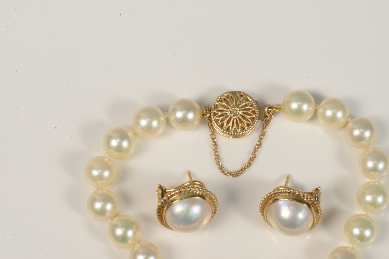 to include 14 karat gold clasp, and pair pearl earrings, set in 14 karat gold
