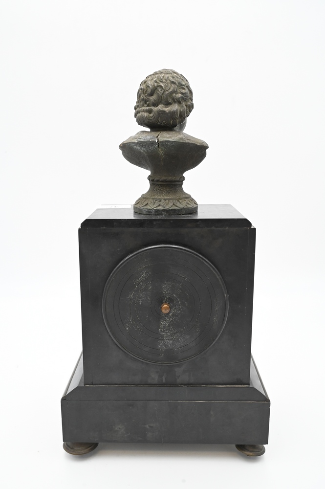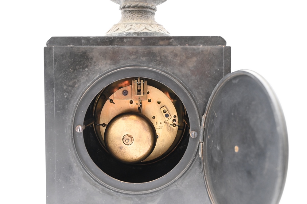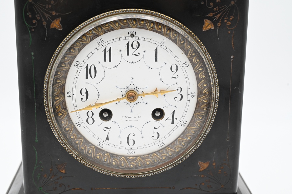 Lot 47: Tiffany and Company Slate Mantle Clock, having enameled dial, marked Tiffany and Company N.Y., height 15 1/2 inches, width 8 1/4 inches.