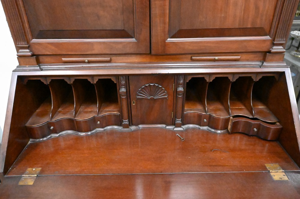 Lot 470: Chippendale Style Mahogany Block Front Secretary Desk, in two parts, upper section having bonnet top with two raised panel doors, flanked by fluted pilasters on lower section, with slant lid over four block front drawers, set on ogee feet, custom made, height 85 inches, width 38 inches.