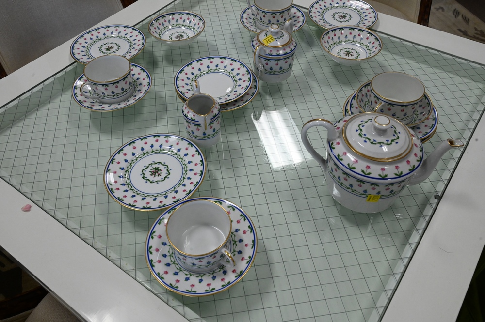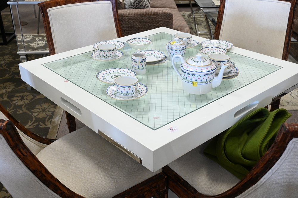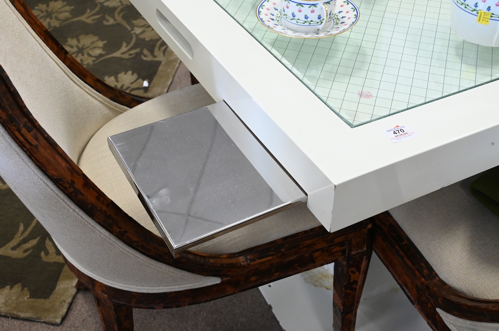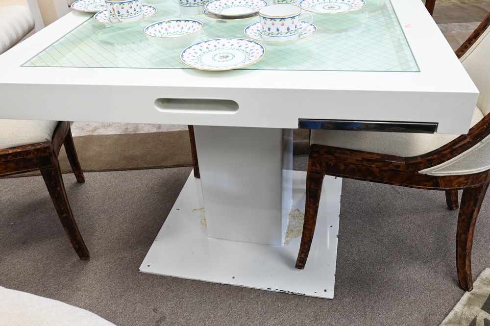 Lot 470: Enrique Garcel Style Games Table, in white lacquer with glass top over four pull out slides on single pedestal, no stamped marks or signatures found, height 28 inches, top 36″ x 36″.
