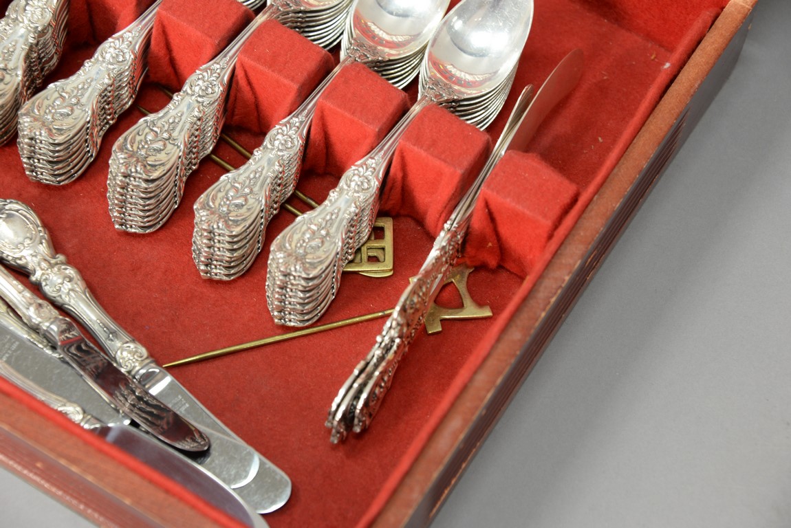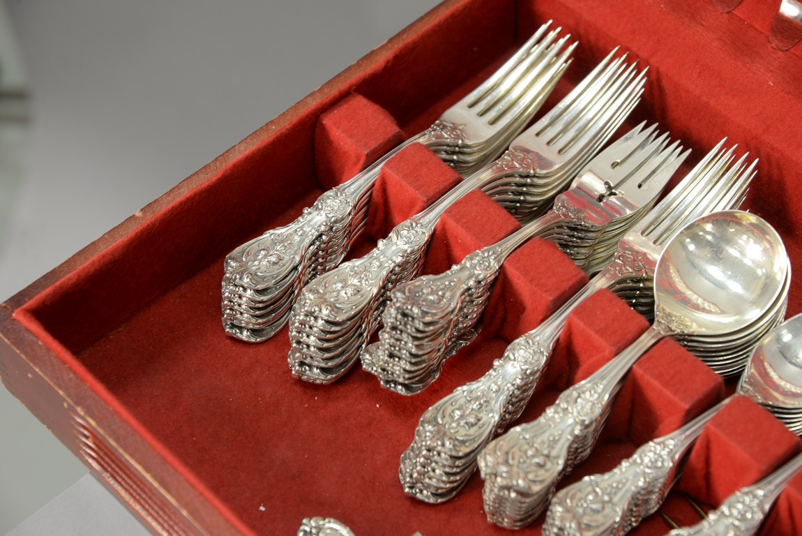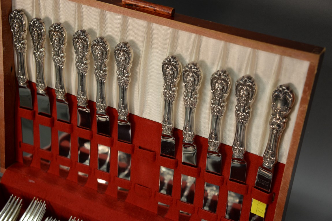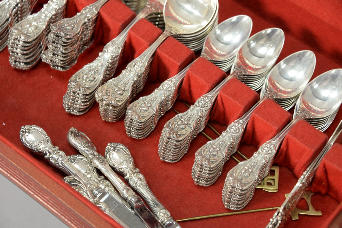 Lot 470: Francis I Reed & Barton sterling silver flatware set including 24 dinner forks, 12 salad forks, 11 soup spoons, 12 butter kn…