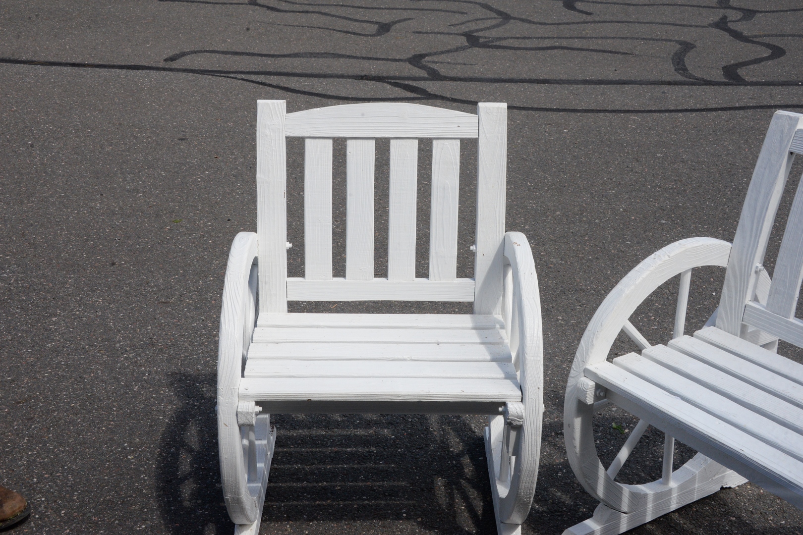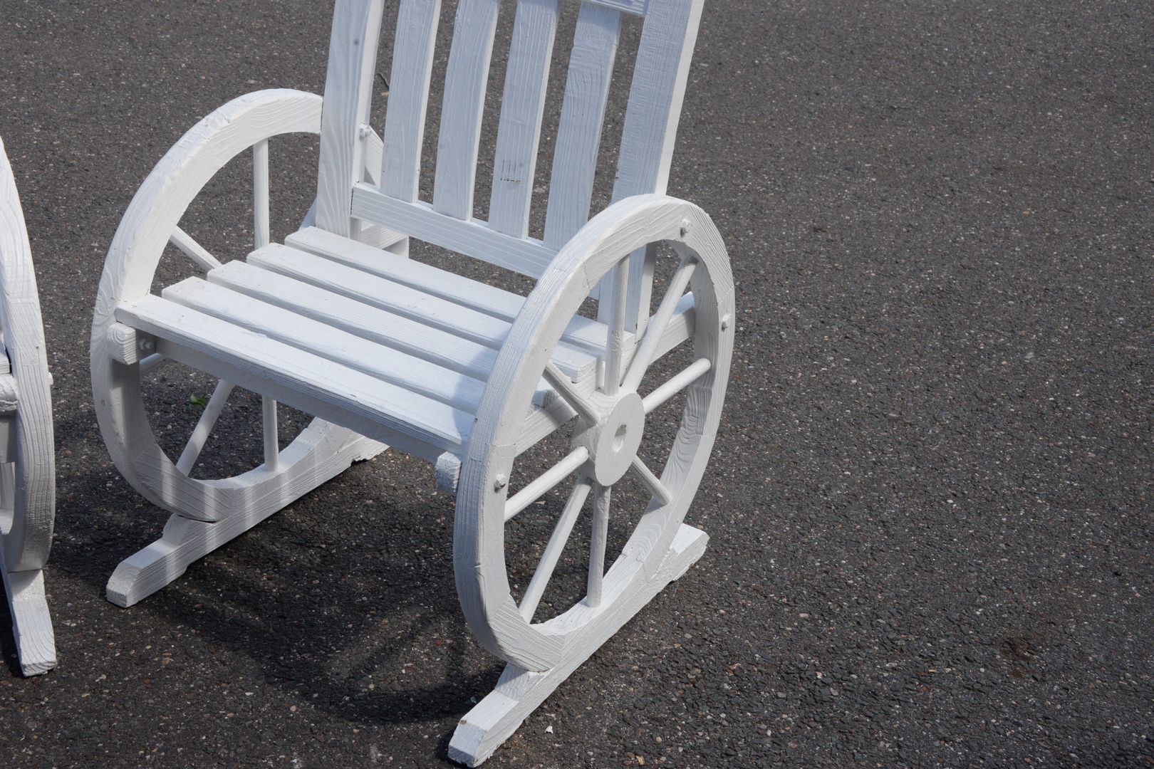 Pair of Wood Wagon Wheels Style Chairs, height 34 inches, width 24 inches.