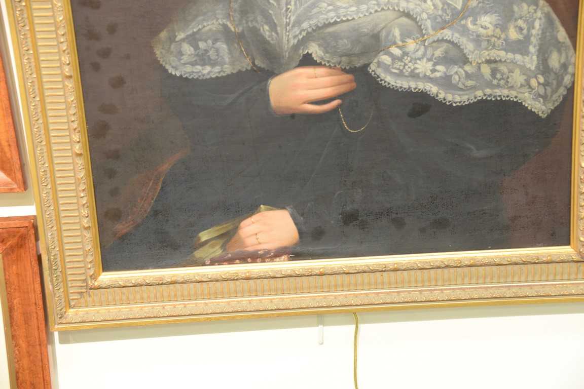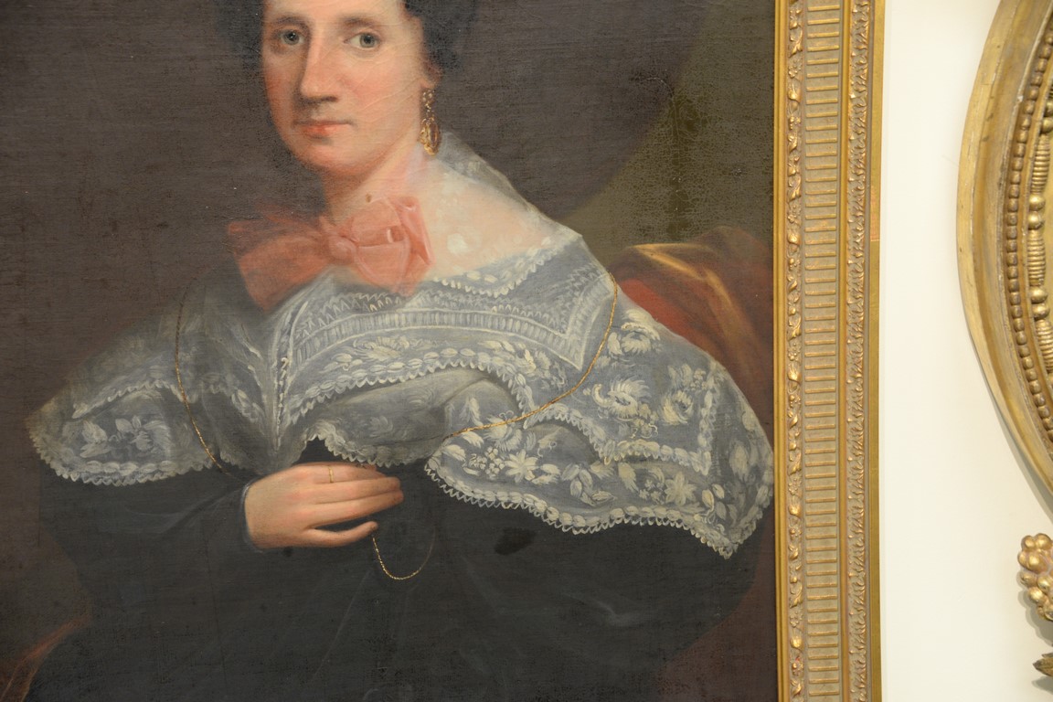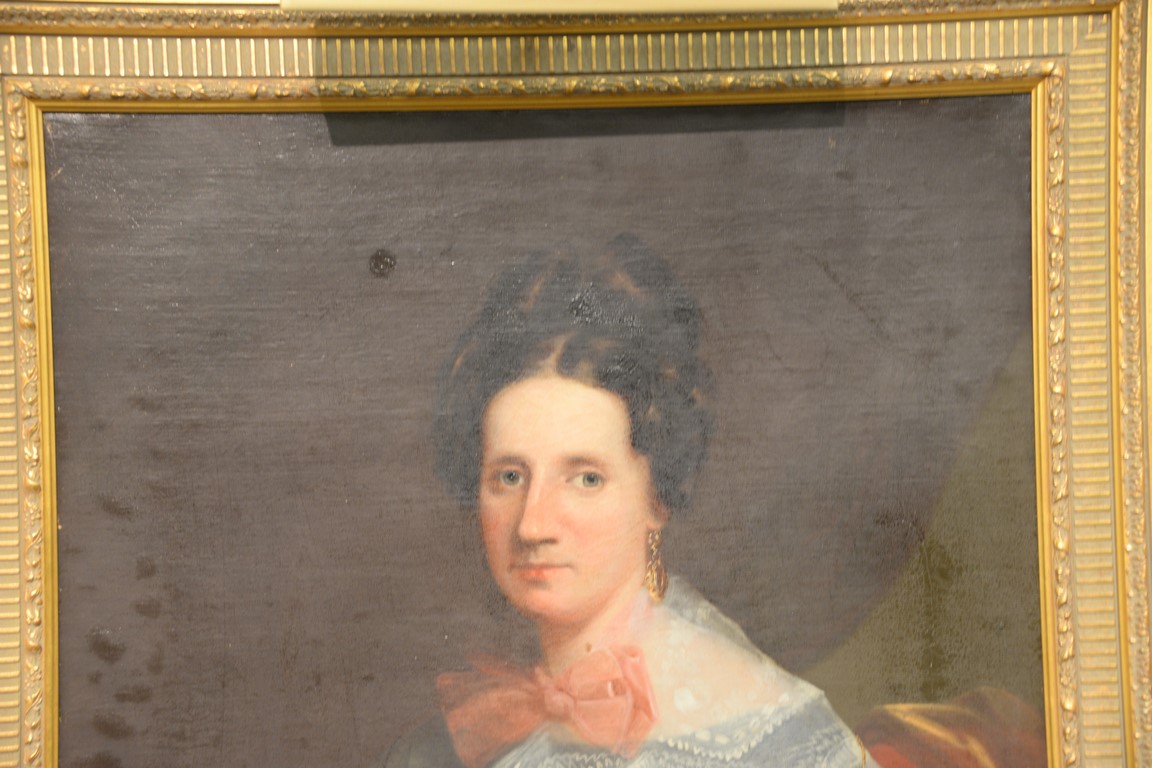 Portrait oil on canvas Woman with Pink Bow unsigned 19th century 36 x 28