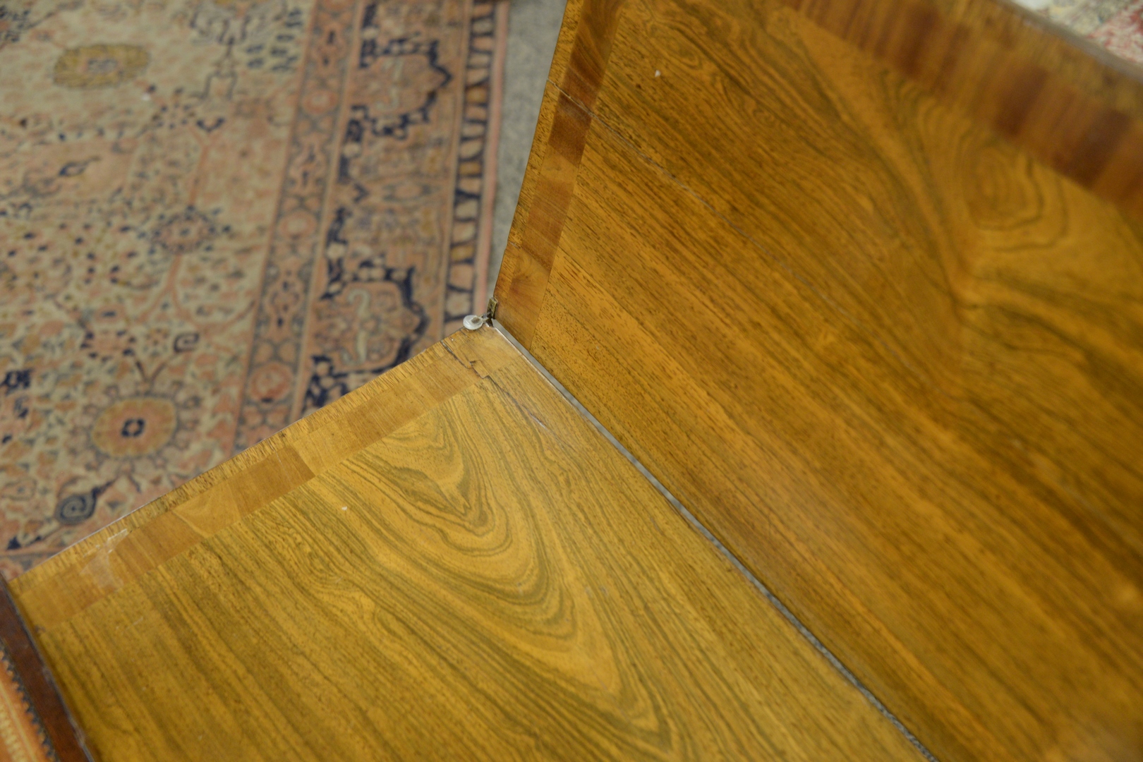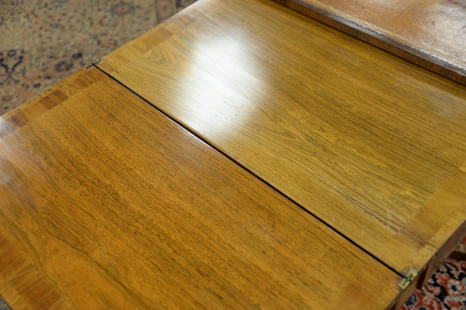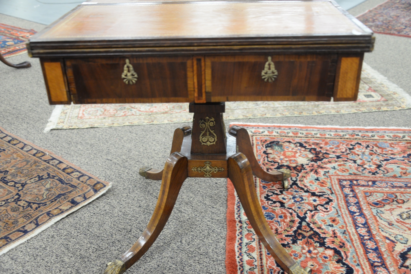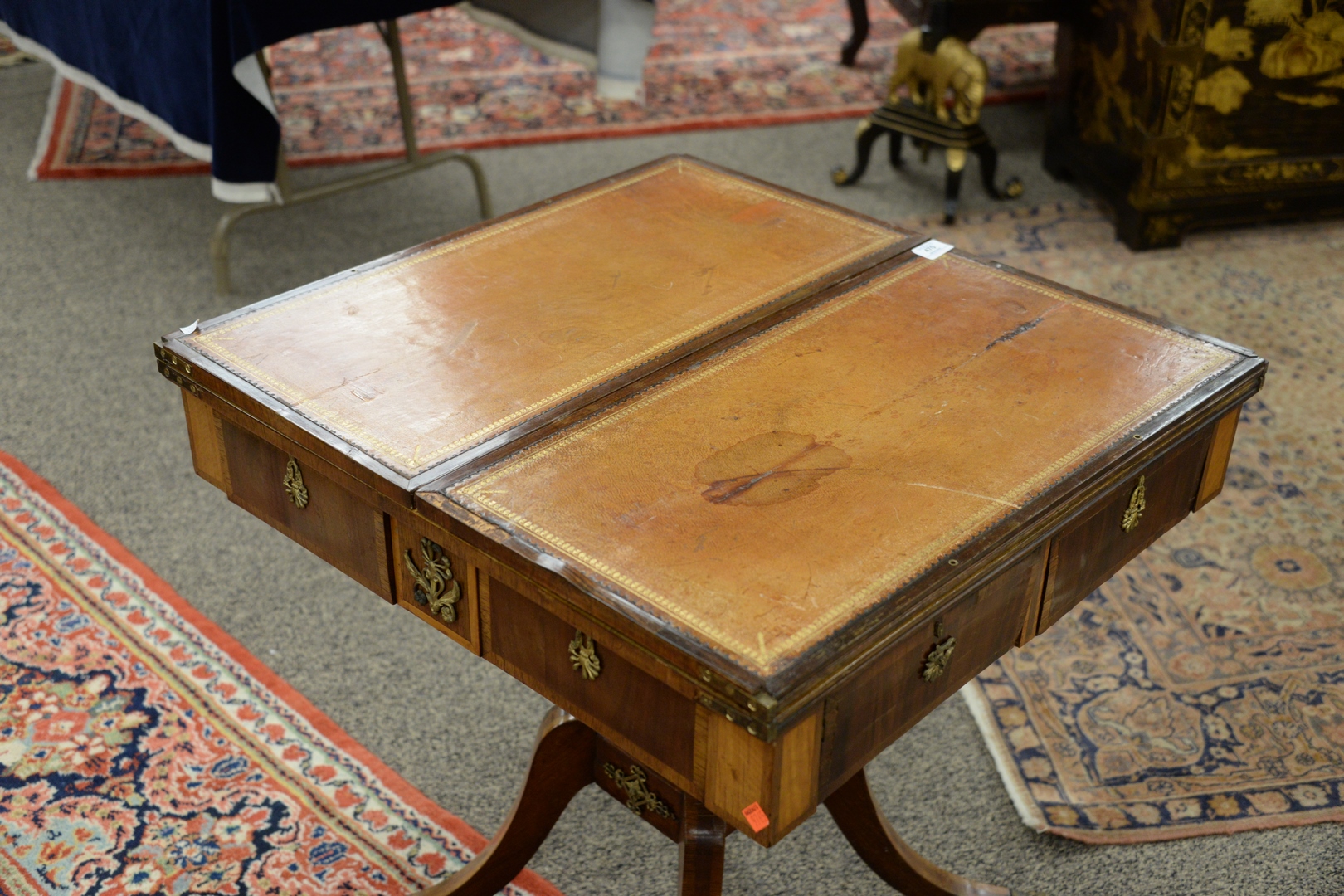 Lot 470: Regency Rosewood Library Table with ormolu mounts, top opens from either end, leather top having two opposite side drawers in frieze, on square shaft on four downswept members, height 29 1/2 inches, width 55 1/4 inches open. Provenance: Christie’s