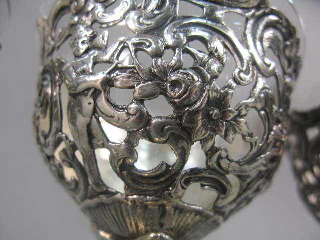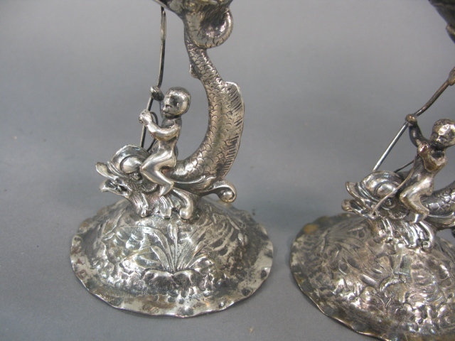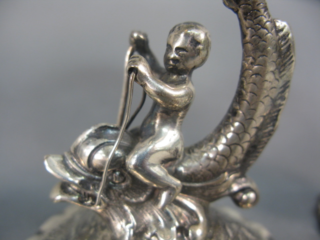 Set of four Continental silver cocktail dishes having reticulated bodies on four puttis riding on dolphin base one fork, in putti hand, as is. Provenance: Governor Henry Roberts Edward Roberts 1110 Prospect Ave Hartford to present owner.