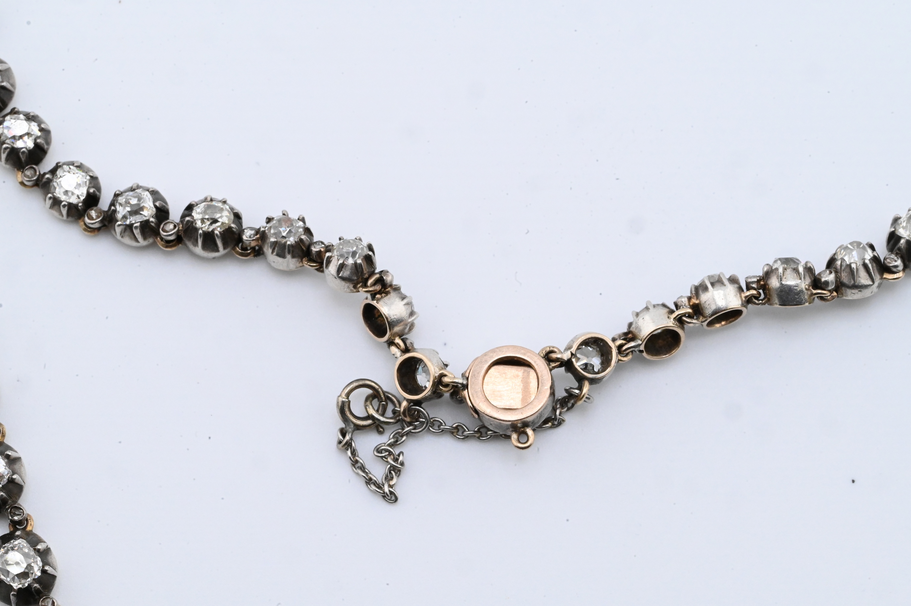 designed as a continuous graduated line of fifty-two old European-cut diamonds with a color grade of G-H and a clarity range of VS-SI, each stone mounted in an open-back silver collet over gold, linked together to form a flexible chain; terminating with a concealed clasp also accented with an old-cut diamond and fitted with an attached safety chain for security, late 18th to 19th century