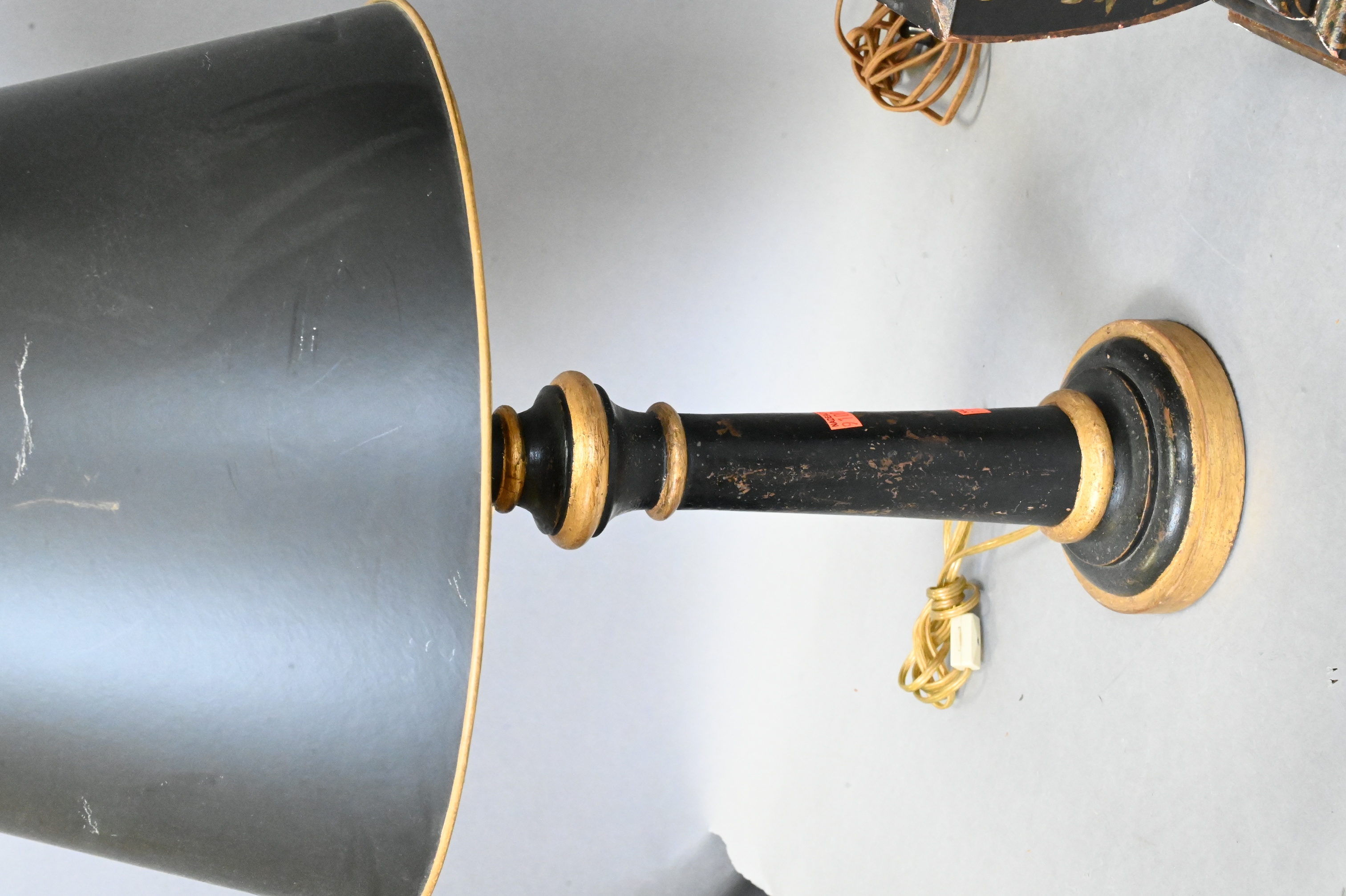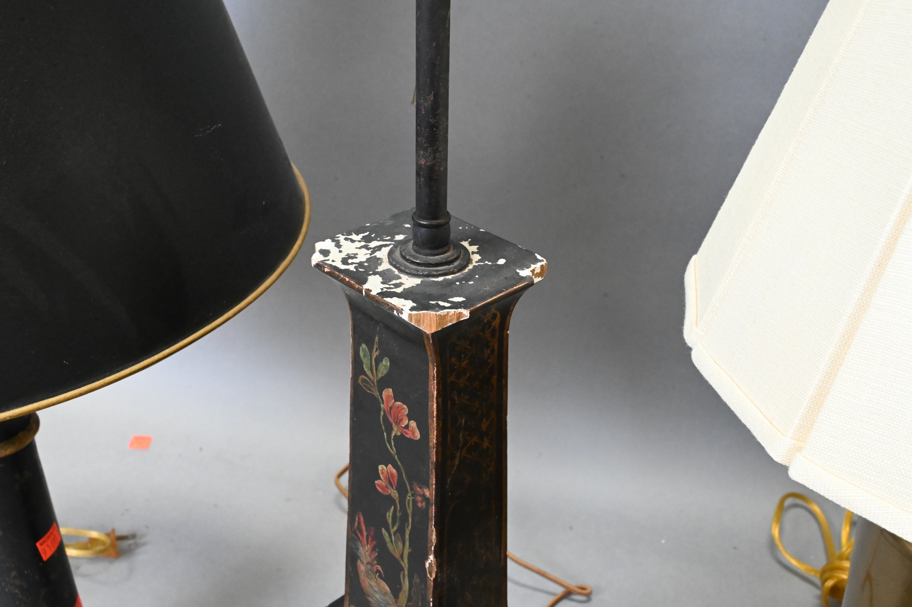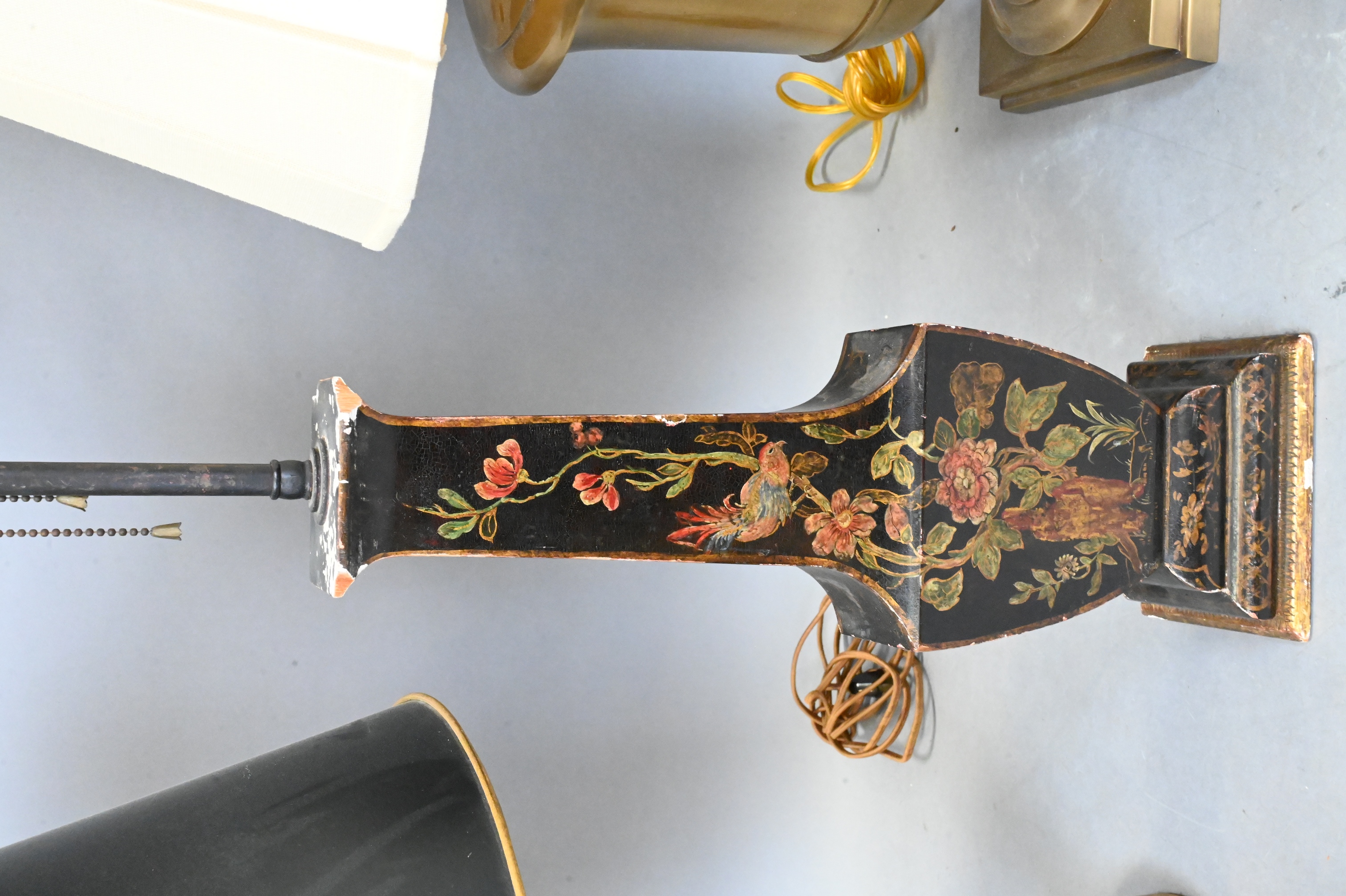 Sarreid Neoclassical style ebonized and gilt wood column form light, carved and giltwood Chinoiserie lamp with flower and bird motif, along with brass urn form lamp