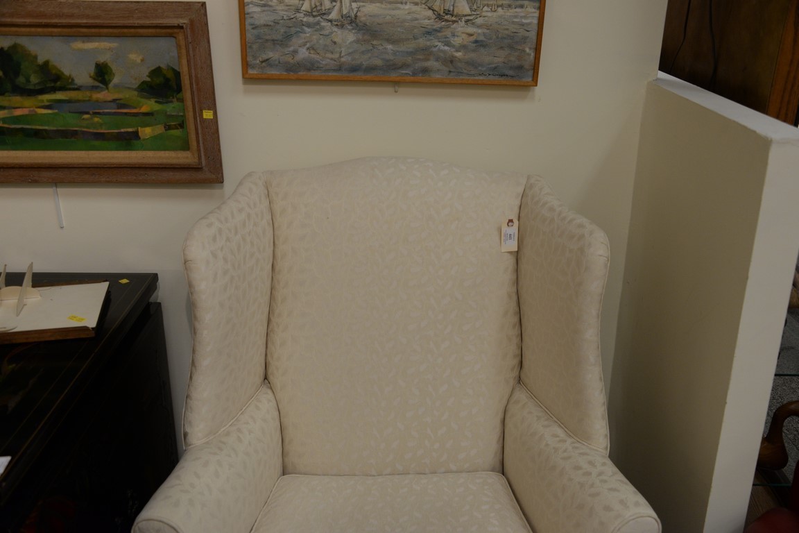 Lot 470: Two upholstered living room chairs including a white wing chair and a striped upholstered chair.