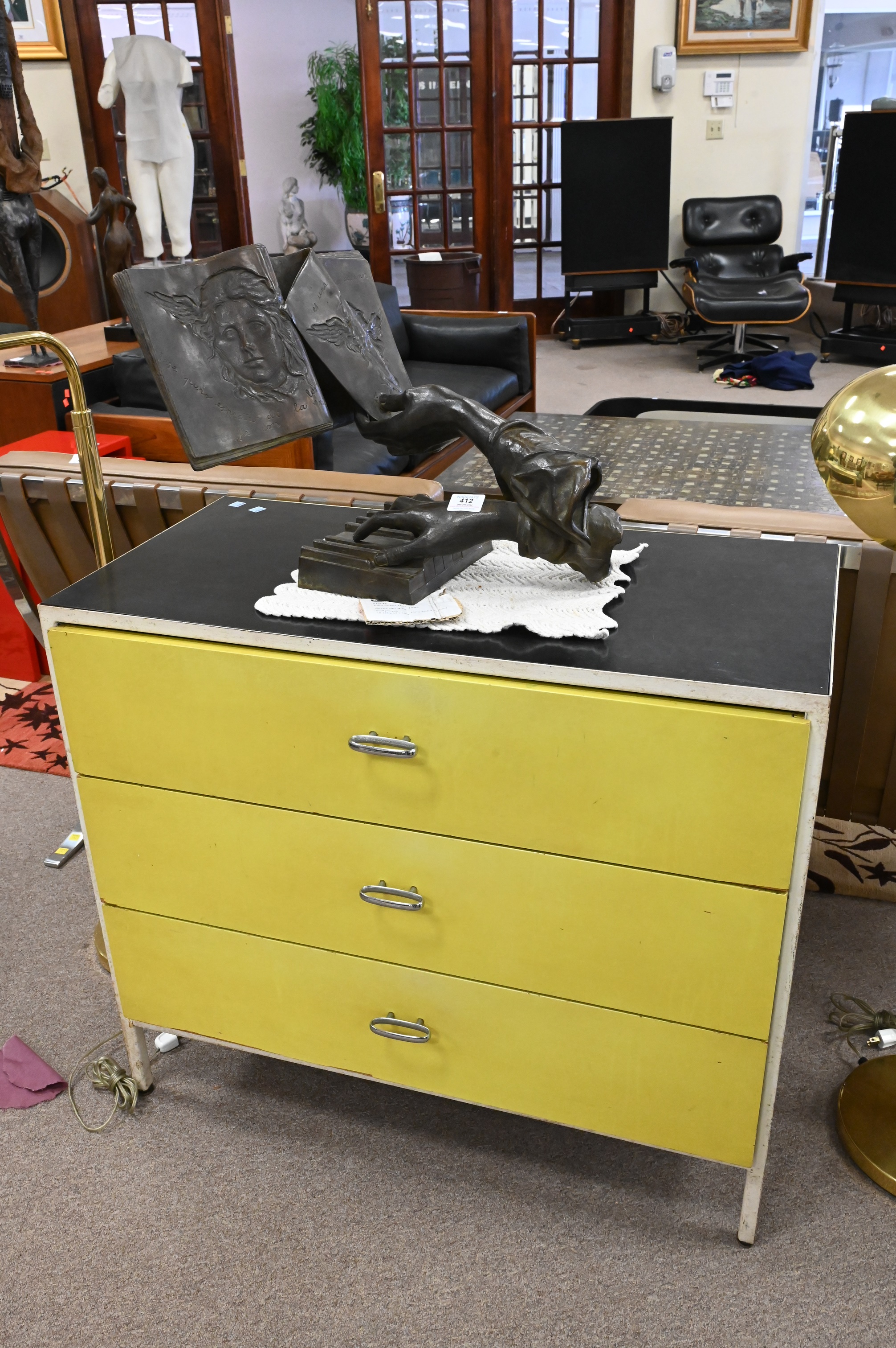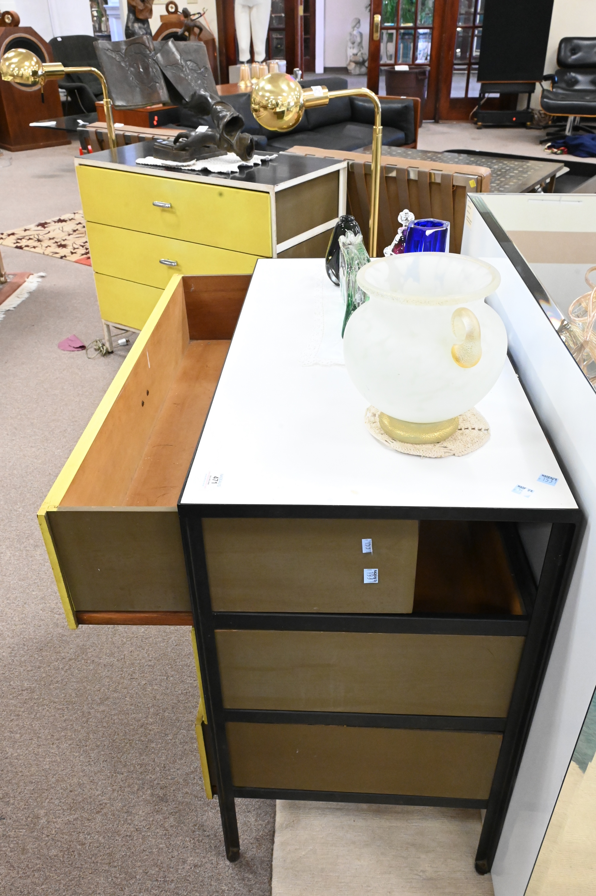 A Pair of George Nelson Herman Miller Three Drawer Steel Frame Chests, height 29 1/2 inches, top 17″ x 33 1/2″.