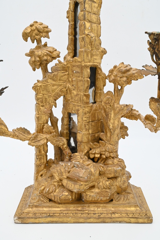 Carved and Gesso GIlt Decorated Candelabra, having mirror windows in tower, height 21 inches. Provenance: Estate of Wallace Bradway, New Haven, CT.