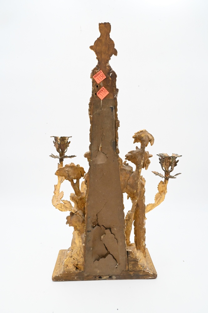 Lot 471: Carved and Gesso GIlt Decorated Candelabra, having mirror windows in tower, height 21 inches. Provenance: Estate of Wallace Bradway, New Haven, CT.