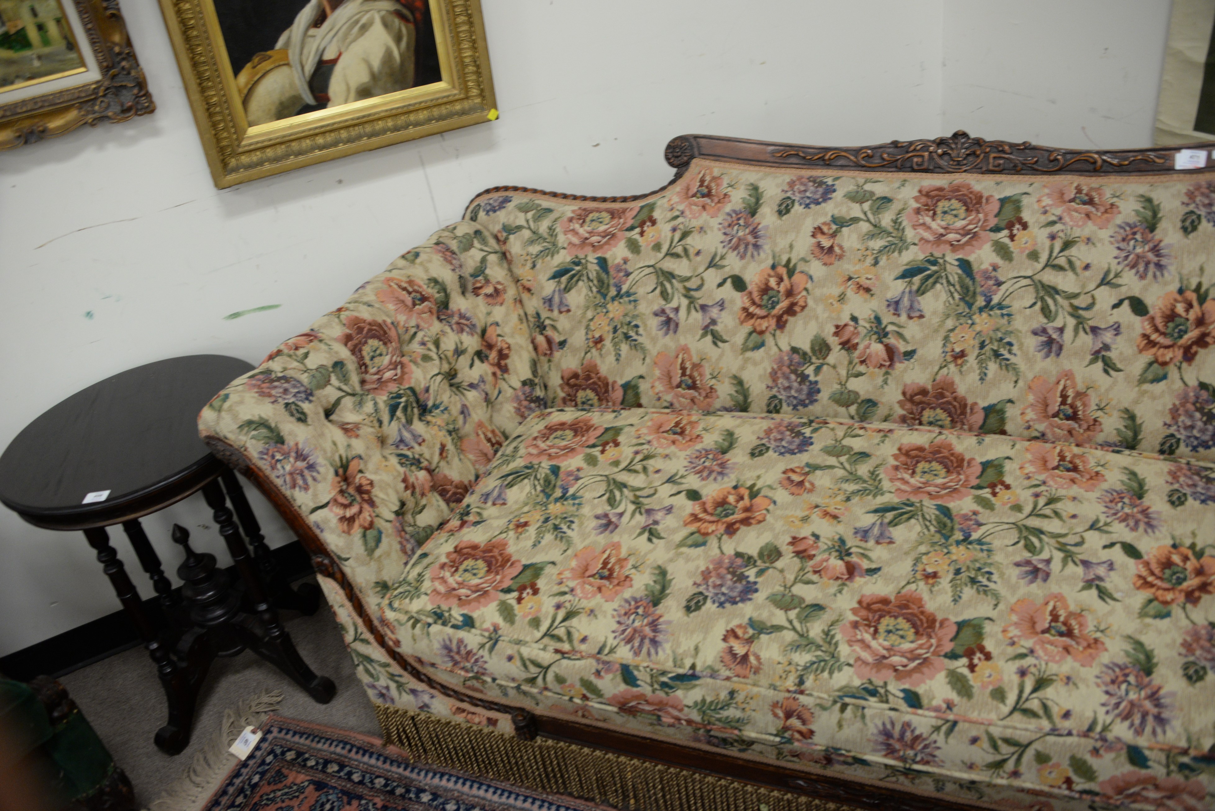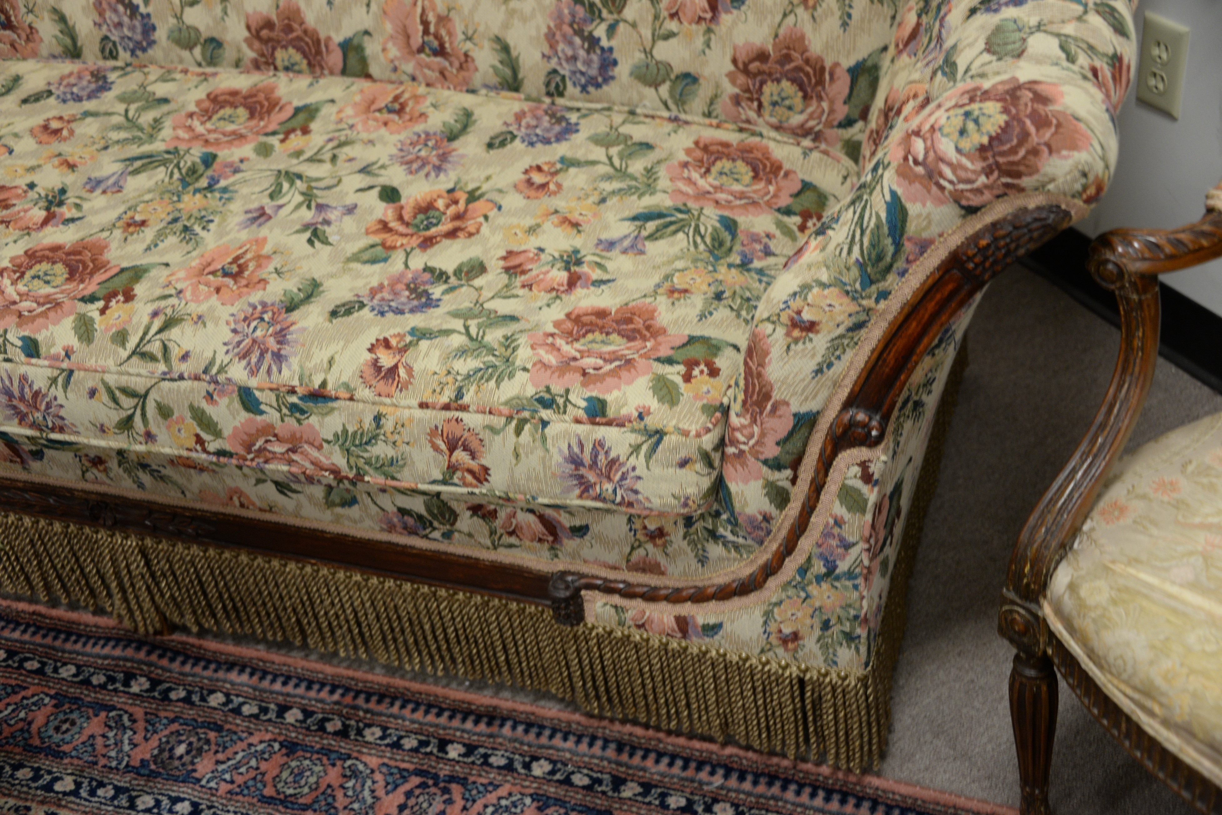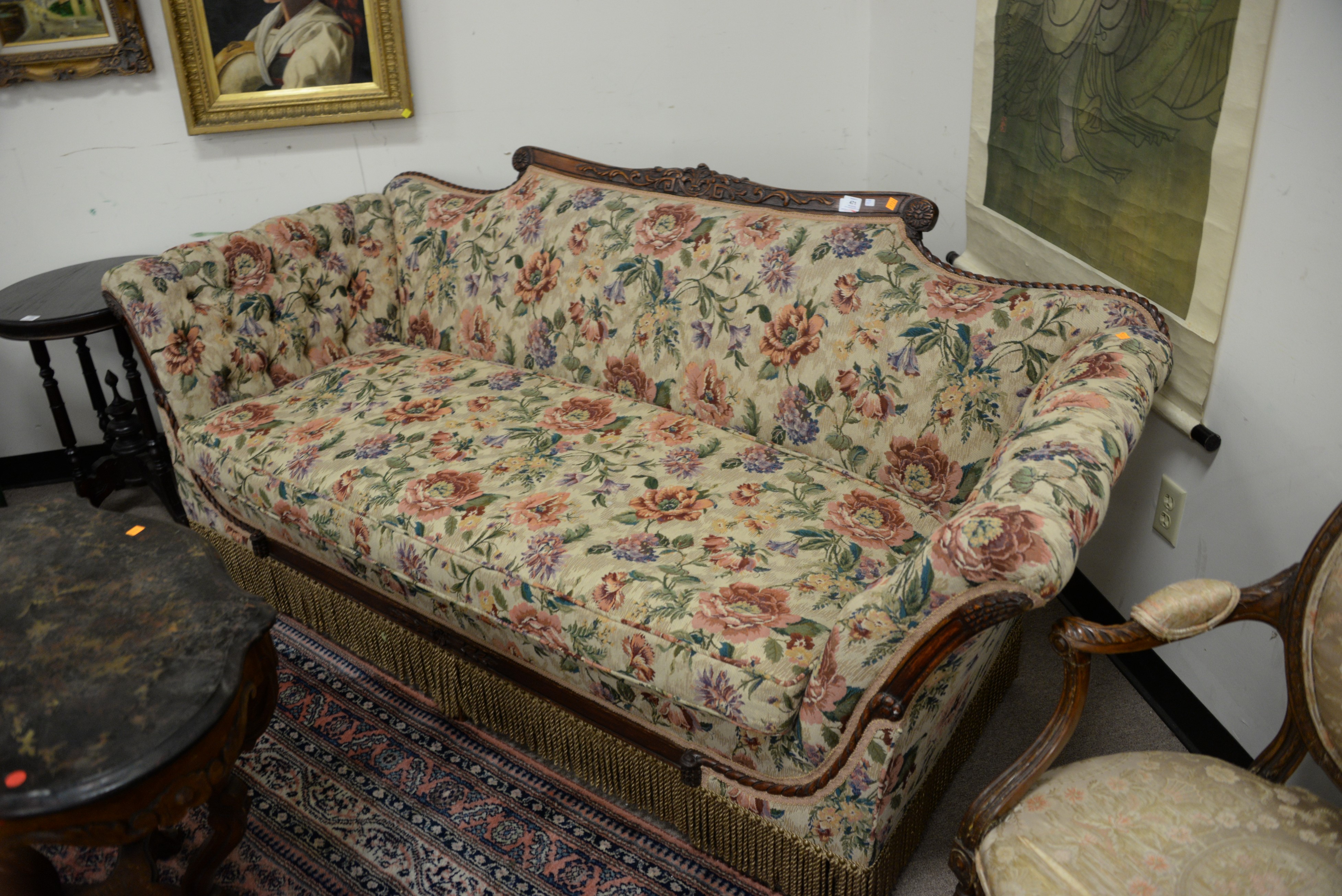 Carved mahogany sofa in tapestry style upholstery. lg. 84 in.