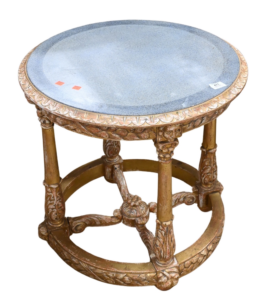 Continental Style Round Side Table, having faux granite top, with gilt decoration, height 23 1/2 inches, diameter 24 inches.