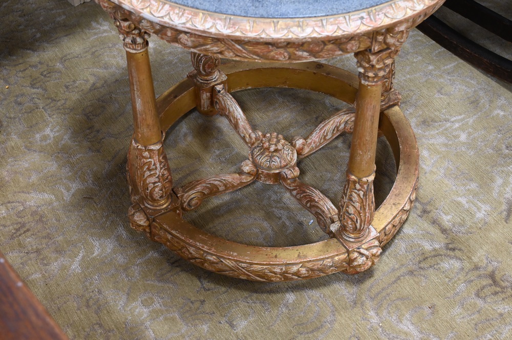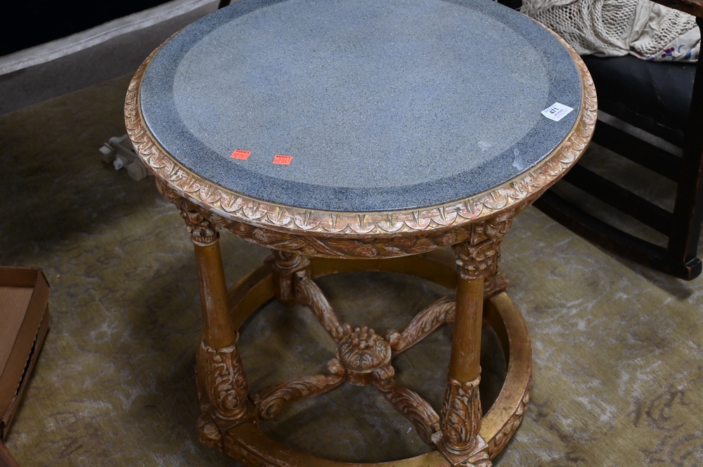 Continental Style Round Side Table, having faux granite top, with gilt decoration, height 23 1/2 inches, diameter 24 inches.