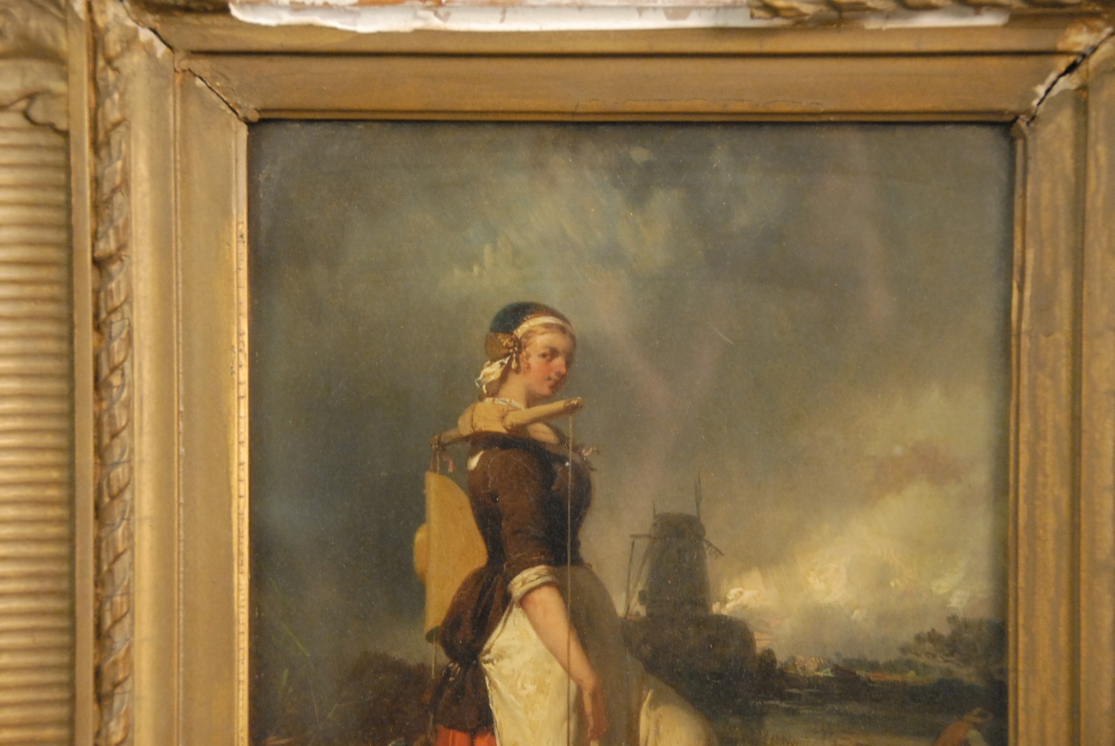 Eugene Le Poittevin 1806-1870 FISHERWOMAN oil on board signed lower left E L Poittevin old paper label on verso 14 x 9 1/2