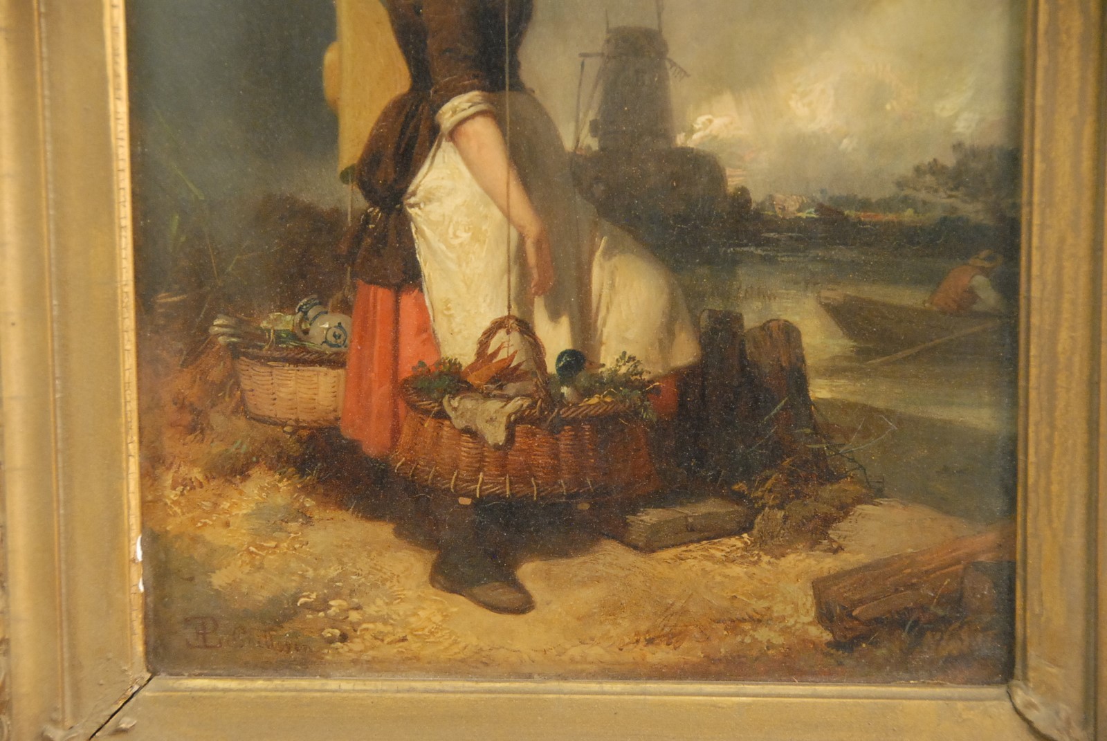 Lot 471: Eugene Le Poittevin 1806-1870 FISHERWOMAN oil on board signed lower left E L Poittevin old paper label on verso 14 x 9 1/2