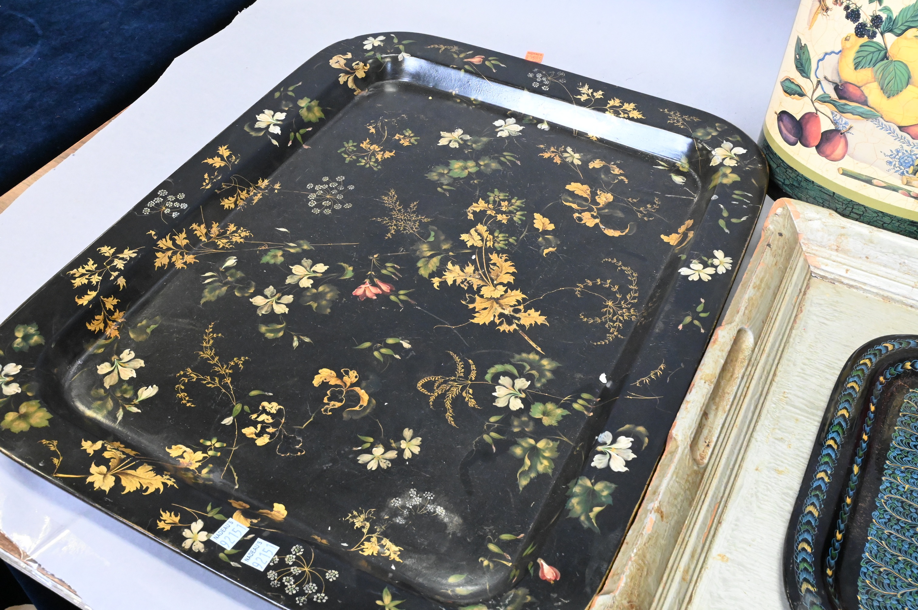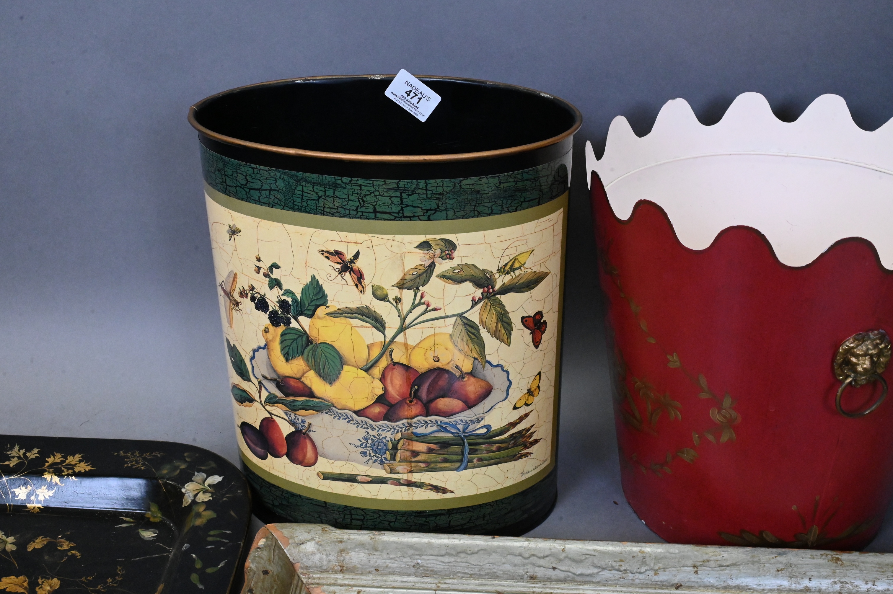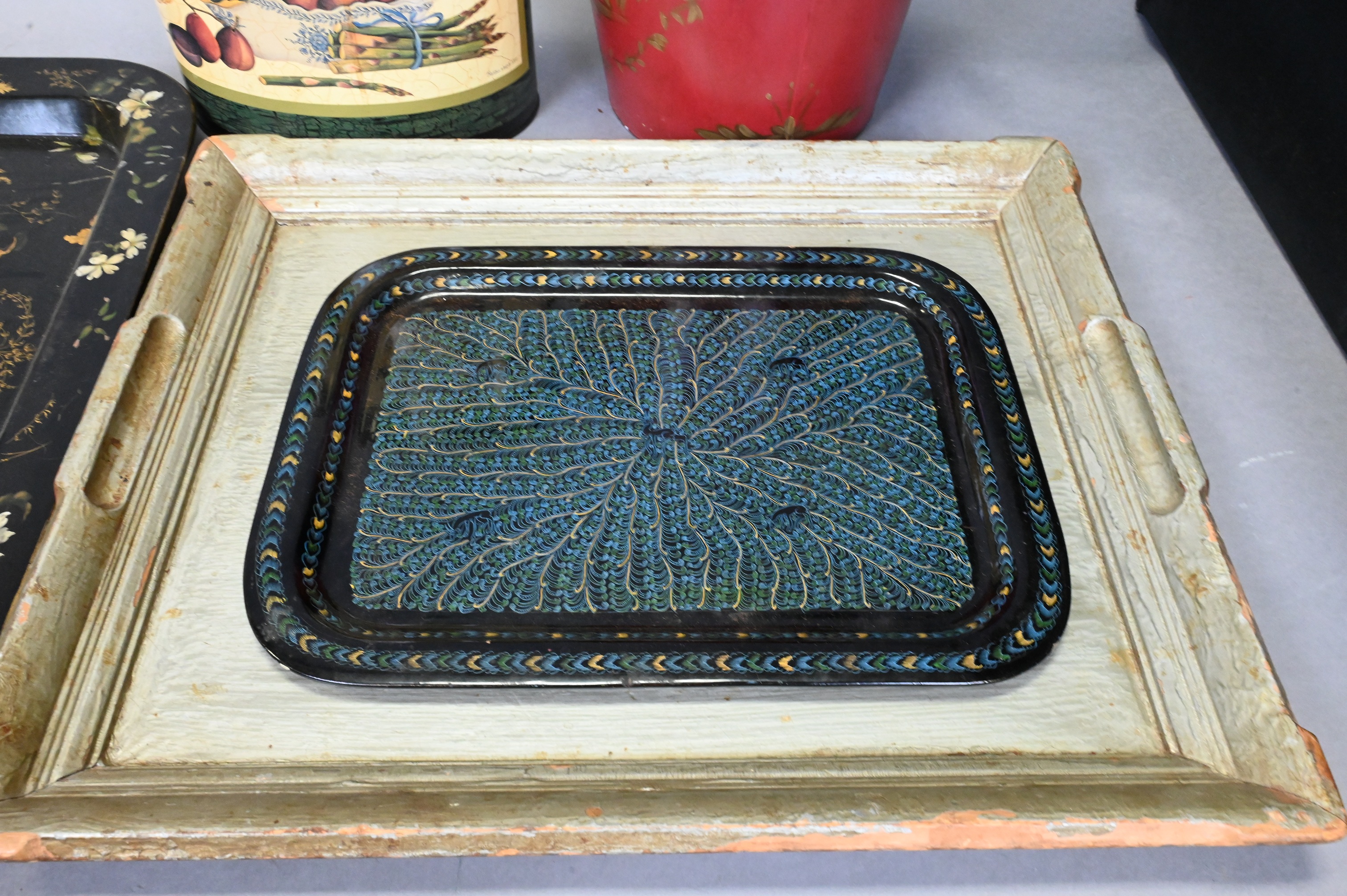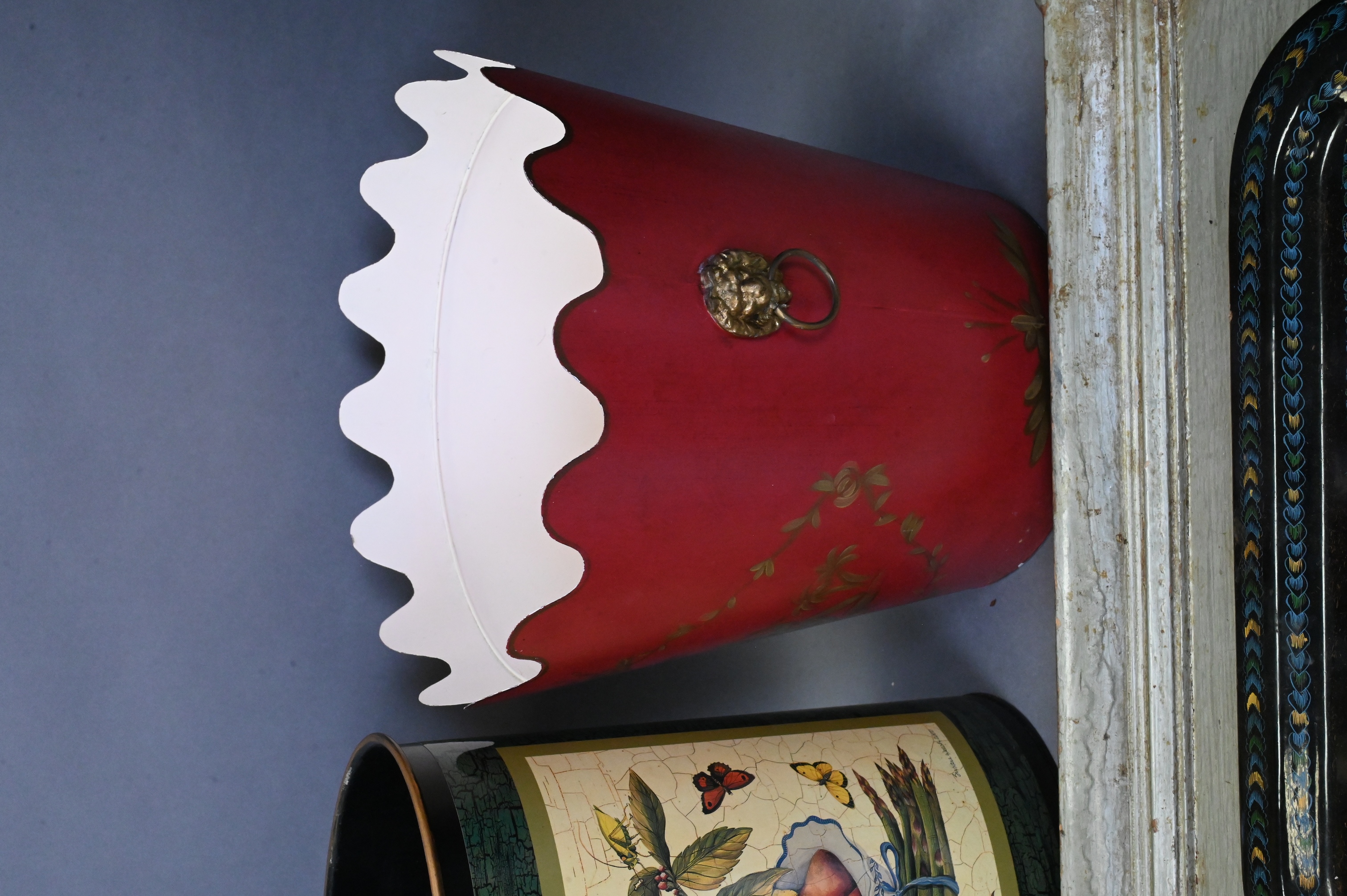 oval tin waste basket (height 14 inches) peacock feather design lacquered tray, painted wooden tray, papier mache floral tray along with red chinoiserie bin with lion handles