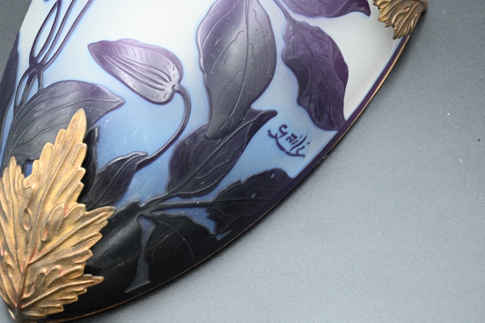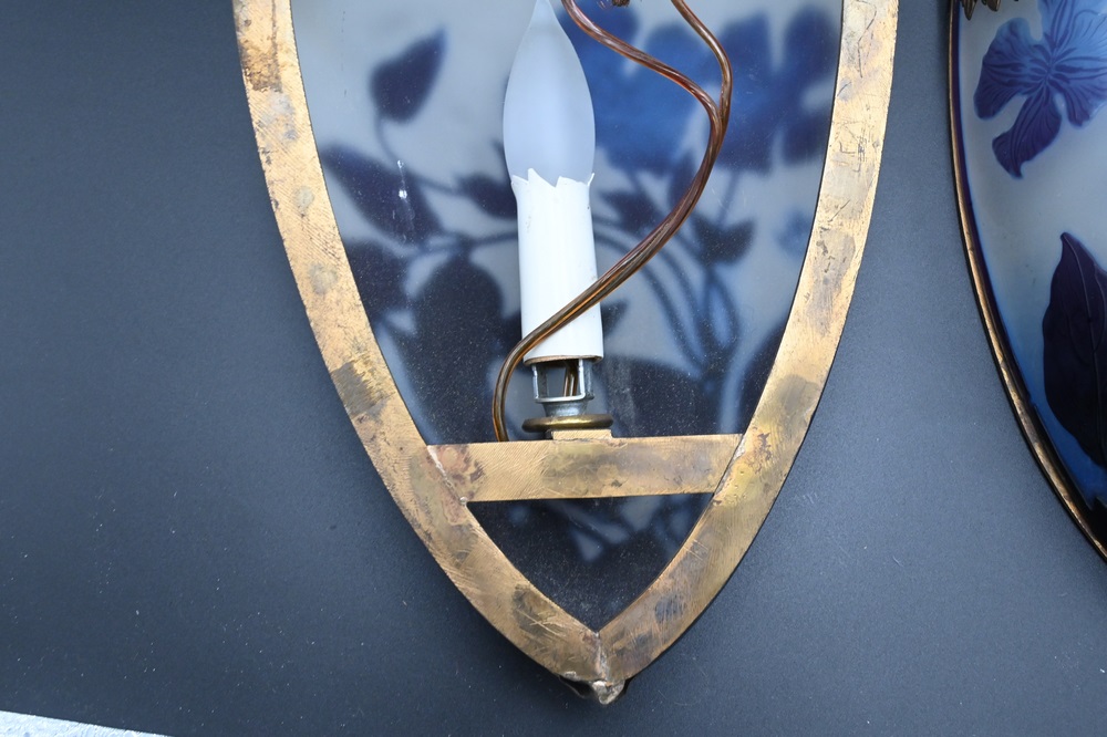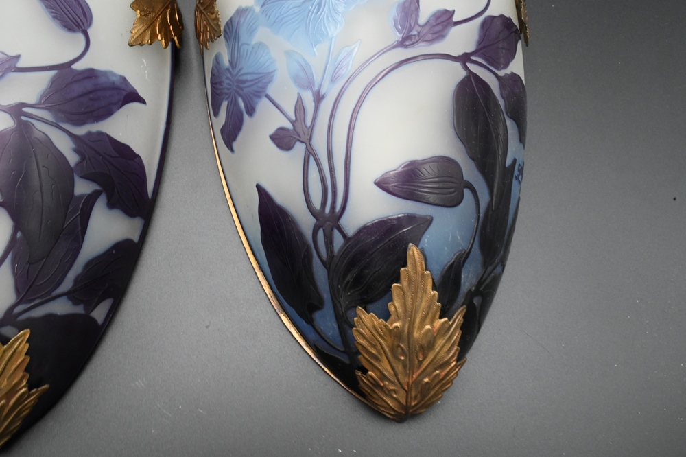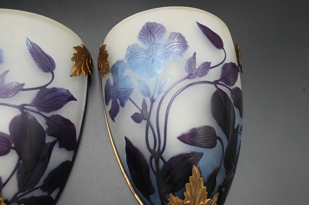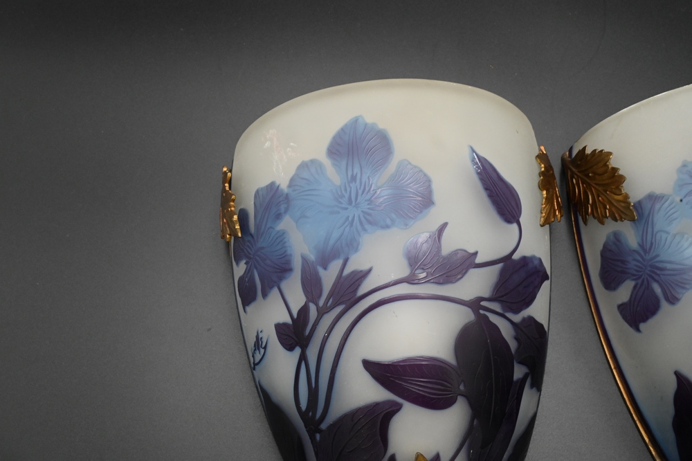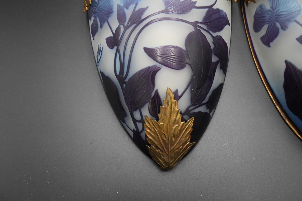 Pair of Galle Cameo Glass Gilt Bronze Mounted Wall Sconces, bullet form frosted glass mottled with cobalt blue and overlaid in purple, cut glass pattern for Clematis blossoms, buds and foliage, each signed in cameo Galle, chip to signature, one leaf support loose, height 9 inches.